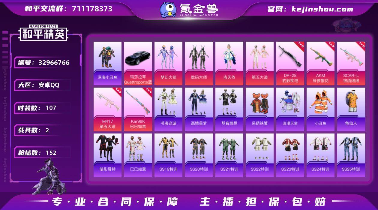 安卓【男神号 粉装-梦幻火箭,套装-浪漫天命,套装-暗影哥特,角色-洛天依,AKM-绿萝繁花(五级),SCAR-L-锦绣绵绵(五级),玛莎拉蒂Quattroporte(夜幕蓝),九霄玄鹿】 手Q-4粉装-9特效枪-2载具-3粉色飞行器-46901热力值-1王牌印记-107套装-152枪皮 【热门品类】:粉装-梦幻火箭,套装-浪漫天命,套装-深海小丑鱼,套装-小丑鱼,套装-龟仙人,套装-暗影哥特 【粉色套装】:粉装-数码大师,粉装-梦幻火箭,角色-洛天依,粉装-第五大道 【粉色枪皮等级】:AKM-绿萝繁花(五级),SCAR-L-锦绣绵绵(五级),AUG-花中眠(三级),AKS-74U-森灵之息(五级),Kar98K-巳巳如意(四级),Mk14-福马献瑞(一级),M417-第五大道(五级),AA12-G-萌骑幻想(五级),DP-28-豹影疾电(五级) 【粉色载具】:玛莎拉蒂Quattroporte(夜幕蓝),九霄玄鹿 【粉色枪皮】:AKM-绿萝繁花,SCAR-L-锦绣绵绵,AUG-花中眠,AKS-74U-森灵之息,Kar98K-巳巳如意,Mk14-福马献瑞,M417-第五大道,AA12-G-萌骑幻想,DP-28-豹影疾电 【粉色飞行器】:炫彩糖果飞行器,千面幻镜飞行器,云梦轻舟飞行器 【粉色降落伞】:梦幻火箭降落伞,千面幻镜降落伞,青空秋雨降落伞,第五大道降落伞,纯梦嫁纱降落伞,飒粉甜心降落伞,...
