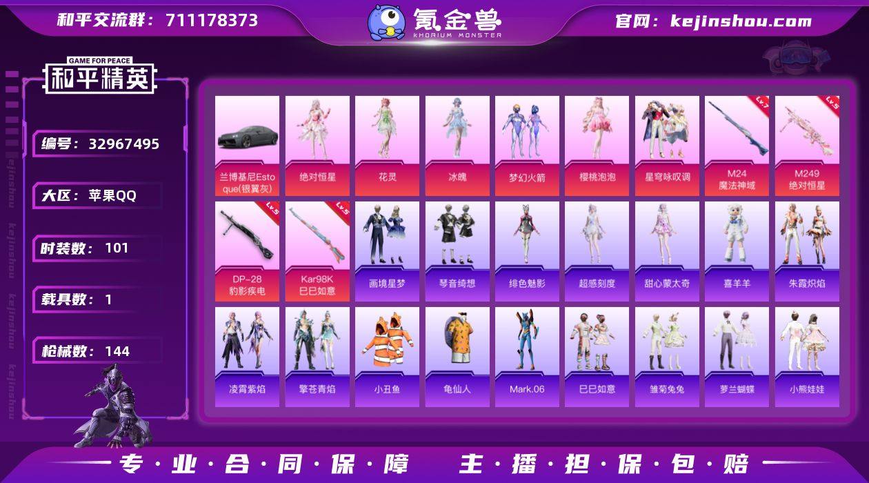 苹果 【粉装-梦幻火箭/套装-小丑鱼/套装-龟仙人/角色-Mark/06/兰博基尼Estoque(银翼灰】手Q-无敌战神框-6粉装-4特效枪-1载具-3粉色飞行器-44079热力值-6王牌印记-101套装-144枪皮 【热门品类】:粉装-梦幻火箭,套装-小丑鱼,套装-龟仙人,角色-Mark.06 【粉色套装】:角色-绝对恒星,粉装-梦幻火箭,角色-樱桃泡泡,粉装-星穹咏叹调,角色-花灵,角色-冰魄 【粉色枪皮等级】:Kar98K-巳巳如意(五级),M24-魔法神域(七级),M249-绝对恒星(七级),DP-28-豹影疾电(五级) 【粉色载具】:兰博基尼Estoque(银翼灰) 【粉色枪皮】:Kar98K-巳巳如意,M24-魔法神域,M249-绝对恒星,DP-28-豹影疾电 【粉色飞行器】:绝对恒星飞行器,炫彩糖果飞行器 【粉色降落伞】:绝对恒星降落伞,梦幻火箭降落伞,守护天翼降落伞,金丰海韵降落伞,樱桃泡泡降落伞,星穹咏叹调降落伞,荧海星豚降落伞,喜羊羊与灰太狼降落伞,异瞳寒姬降落伞,极意拳锋降落伞,炫彩糖果降落伞 【稀有套装】:套装-龟仙人,套装-巳巳如意,角色-超感刻度,角色-甜心蒙太奇,套装-雪国风尚,套装-炫彩糖果,套装-雏菊兔兔,套装-萝兰蝴蝶,套装-小熊娃娃,角色-米开朗基罗,套装-火种守卫者,套装-糖糖葫芦,套装-...