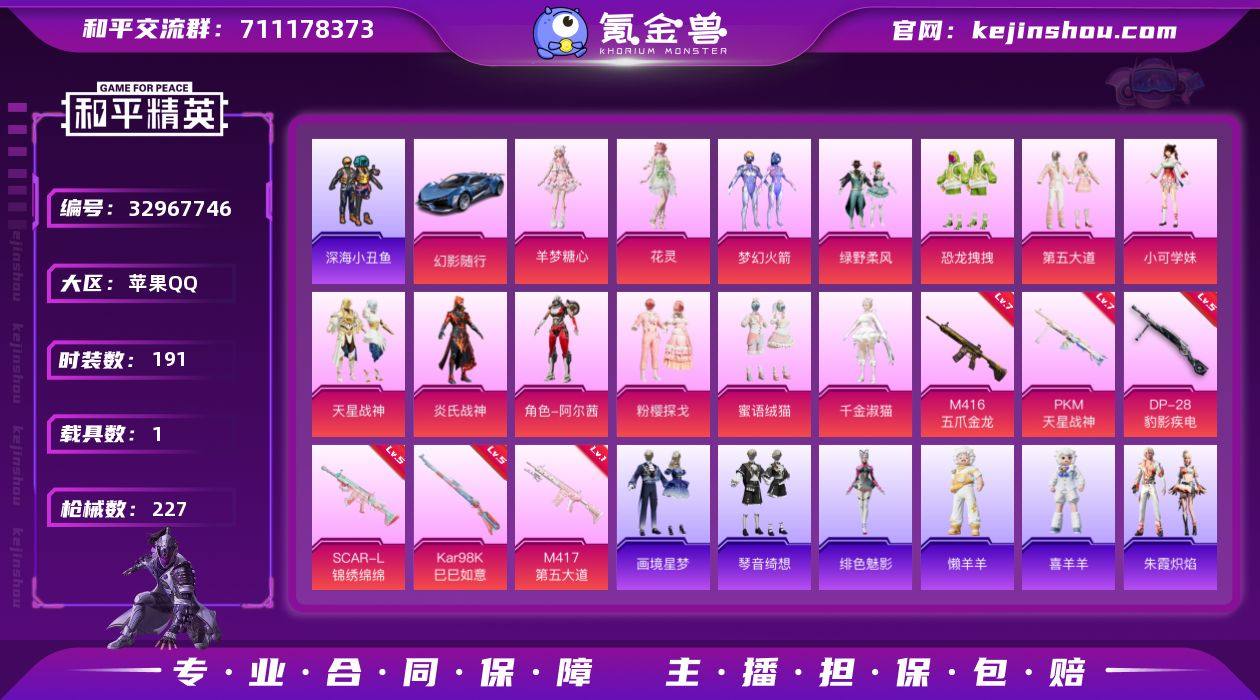 苹果 【小号 粉装-梦幻火箭/套装-深海小丑鱼/角色-羊梦糖心/SCAR-L-锦绣绵绵(五级)/M416-五爪金龙(七级/Kar98K-巳巳如意(五级)/幻影随行/精灵迷巫背包/梦幻火箭背包】手Q-13粉装-6特效枪-1载具-4粉色飞行器-79385热力值-19王牌印记-191套装-227枪皮 【热门品类】:粉装-梦幻火箭,套装-深海小丑鱼,套装-小丑鱼,角色-军刀雅典娜,套装-SS1特训,套装-龟仙人,套装-潮萌小黄鸭,熔岩游骑兵连帽夹克 【粉色套装】:粉装-梦幻火箭,粉装-绿野柔风,粉装-恐龙拽拽,粉装-第五大道,角色-小可学妹,粉装-天星战神,粉装-炎氏战神,角色-阿尔茜,粉装-粉樱探戈,粉装-蜜语绒猫,角色-千金淑猫,角色-花灵,角色-羊梦糖心 【粉色枪皮等级】:SCAR-L-锦绣绵绵(五级),M416-五爪金龙(七级),Kar98K-巳巳如意(五级),M417-第五大道(一级),DP-28-豹影疾电(五级),PKM-天星战神(七级) 【粉色载具】:幻影随行 【粉色枪皮】:SCAR-L-锦绣绵绵,M416-五爪金龙,Kar98K-巳巳如意,M417-第五大道,DP-28-豹影疾电,PKM-天星战神 【粉色飞行器】:炫彩糖果飞行器,梦幻火箭飞行器,粉樱探戈飞行器 【粉色降落伞】:至尊龙雀降落伞,春暖花开降落伞,梦幻火箭降落伞,炫紫旋律降落伞,恐龙拽拽...