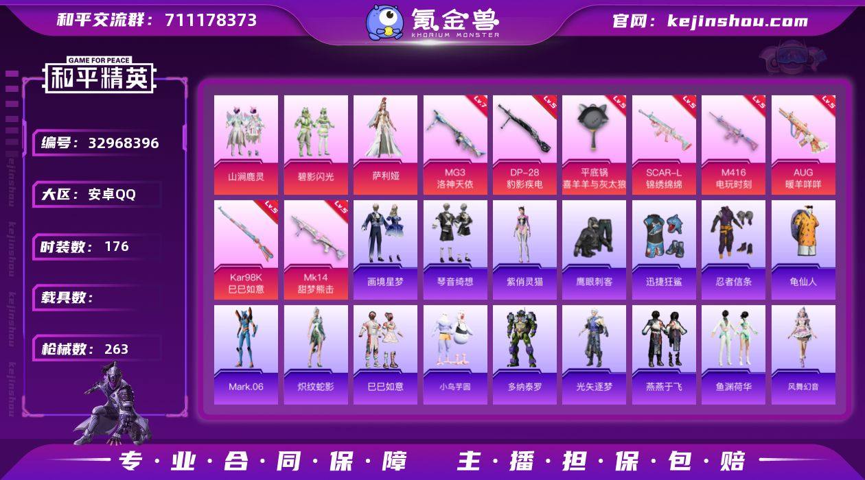 安卓 手Q-4粉装-11特效枪-0载具-3粉色飞行器-74281热力值-9王牌印记-176套装-263枪皮 【热门品类】:套装-忍者信条,套装-AG战队服,套装-龟仙人,角色-Mark.06 【粉色套装】:粉装-山涧鹿灵,粉装-碧影闪光,角色-萨利娅,角色-辉云木星 【粉色枪皮等级】:SCAR-L-锦绣绵绵(五级),M416-电玩时刻(五级),AUG-暖羊咩咩(五级),UMP45-萌骑冒险(五级),AKS-74U-森灵之息(五级),Kar98K-巳巳如意(五级),Mk14-甜梦熊击(五级),Mk14-福马献瑞(五级),DP-28-豹影疾电(五级),MG3-洛神天依(七级),平底锅-喜羊羊与灰太狼(六级) 【粉色枪皮】:SCAR-L-锦绣绵绵,M416-电玩时刻,AUG-暖羊咩咩,UMP45-萌骑冒险,AKS-74U-森灵之息,Kar98K-巳巳如意,Mk14-甜梦熊击,Mk14-福马献瑞,DP-28-豹影疾电,MG3-洛神天依,平底锅-喜羊羊与灰太狼 【粉色飞行器】:炫彩糖果飞行器,齐天大圣飞行器,镜光幻境飞行翼 【粉色降落伞】:梦幻火箭降落伞,甜蜜誓约降落伞,齐天大圣降落伞,洛神天依降落伞,风花雪月降落伞,环太平洋降落伞,千面幻镜降落伞,飒粉甜心降落伞,鎏金朋克降落伞,电糖天使降落伞,精灵梦叶罗丽降落伞,鬼刀降落伞,智耀战神降落伞,幻彩电音降落伞,时光之誓降落伞,无垠...