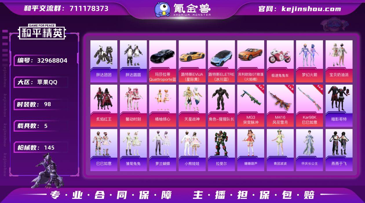 苹果【男神号 粉装-梦幻火箭,套装-胖达团团,套装-胖达圆圆,套装-暗影哥特,M416-风花雪月(五级),Kar98K-巳巳如意(五级),MG3-突变脉冲(七级),路特斯EVIJA(星际黄),路特斯ELETRE(冰川蓝),玛莎拉蒂Quattroporte(夜幕蓝),宾利欧陆GT敞篷(火焰橘)】 手Q-7粉装-3特效枪-5载具-2粉色飞行器-50960热力值-4王牌印记-98套装-145枪皮 【热门品类】:粉装-梦幻火箭,套装-胖达团团,套装-胖达圆圆,套装-暗影哥特 【粉色套装】:粉装-宝贝奶油派,粉装-梦幻火箭,粉装-炙焰红王,粉装-馨动时刻,粉装-橘柚倾心,粉装-天星战神,角色-猩猩队长 【粉色枪皮等级】:M416-风花雪月(五级),Kar98K-巳巳如意(五级),MG3-突变脉冲(七级) 【粉色载具】:路特斯EVIJA(星际黄),路特斯ELETRE(冰川蓝),玛莎拉蒂Quattroporte(夜幕蓝),宾利欧陆GT敞篷(火焰橘),极速兔兔车,僚机-萌兔起飞 【粉色枪皮】:M416-风花雪月,Kar98K-巳巳如意,MG3-突变脉冲 【粉色飞行器】:梦幻火箭飞行器,青春物语飞行器 【粉色降落伞】:甜心宝贝降落伞,春暖花开降落伞,梦幻火箭降落伞,蓝莓炮弹降落伞,甜心娃娃降落伞,恐龙拽拽降落伞,橘柚倾心降落伞,猪猪侠降落伞,忍者神龟降落伞,...