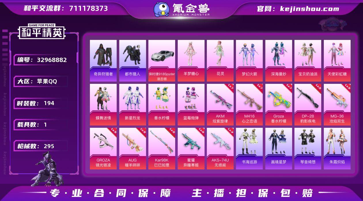 实名: 不可修改 时装数: 194 载具数: 1 枪械数: 295 战备数: 183 热门装扮: 奇异狩猎者,梦幻火箭(新101),蝶舞迷情,深海曼妙,宝贝奶油派,天使彩虹糖,暗夜武装,迅捷狂鲨,鹰眼刺客,都市猎人,香水柠檬,新星烈龙,蓝莓炮弹,潮萌小黄鸭,大橘为重,激萌罗小黑,奇迹天团,软萌银虎,神秘黑猫,羊梦糖心,花灵 载具: 保时捷918Spyder(液态银) 稀有枪皮: AKM炫紫旋律,M416心之恋语,Groza香水柠檬,GROZA-镜光银凌,Kar98K-巳巳如意,AUG-暖羊咩咩,AKS-74U-无垠阁,DP-28-豹影疾电,MG-36-沧焰双生,蜜獾-异瞳寒姬 亮点: 苹果 【身法号 梦幻火箭/浪漫天命/都市猎人/奇异狩猎者/暗影哥特/AKM-炫紫旋律(七级)/M416-心之恋语(七级)/保时捷918 Spyder(液态银)】手Q-10粉装-11特效枪-1载具-5粉色飞行器-91654热力值-15王牌印记-194套装-295枪皮【热门品类】:粉装-梦幻火箭,套装-浪漫天命,套装-都市猎人,套装-奇异狩猎者,套装-潮萌小黄鸭,套装-暗影哥特【粉色套装】:粉装-深海曼妙,粉装-宝贝奶油派,粉装-天使彩虹糖,粉装-蝶舞迷情,粉装-梦幻火箭,粉装-新星烈龙,粉装-香水柠檬,粉装-蓝莓炮弹,角色-花灵,角色-羊梦糖心【粉色枪皮等级】:AKM-炫紫旋律(七级),M416-心之恋语(七级),GROZA-香...