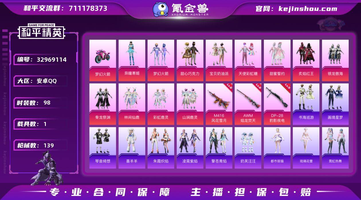 安卓【公主号 粉装-梦幻火箭,甜心三姐妹,M416-风花雪月(六级),AWM-焰龙焚天(六级),双人摩托-梦幻火箭】 手Q-12粉装-3特效枪-1载具-2粉色飞行器-42424热力值-5王牌印记-98套装-139枪皮 【热门品类】:粉装-梦幻火箭 【粉色套装】:粉装-甜心巧克力,粉装-宝贝奶油派,粉装-天使彩虹糖,粉装-梦幻火箭,粉装-甜蜜誓约,粉装-炙焰红王,粉装-银龙傲海,粉装-骨龙祭渊,粉装-林间仙鹿,粉装-彩虹鹿灵,粉装-山涧鹿灵,角色-异瞳寒姬 【粉色枪皮等级】:M416-风花雪月(六级),AWM-焰龙焚天(六级),DP-28-豹影疾电(五级) 【粉色载具】:双人摩托-梦幻火箭 【粉色枪皮】:M416-风花雪月,AWM-焰龙焚天,DP-28-豹影疾电 【粉色飞行器】:梦幻火箭飞行器,相思残雪飞行器 【粉色降落伞】:甜心宝贝降落伞,梦幻火箭降落伞,甜蜜誓约降落伞,童趣迷兔降落伞,机甲封神降落伞,焰龙焚天降落伞,林间仙鹿降落伞,炙焰牛王降落伞,彩虹甜喵降落伞,星穹咏叹调降落伞 【稀有套装】:套装-雪国风尚,角色-都市丽猫,角色-琉璃花蕾,套装-霓虹热舞,套装-极速光影,套装-彩虹兔,套装-云朵鹅,套装-雪绒豹,套装-诡诞巡游,套装-混沌火种,套装-朱霞炽焰,套装-凌霄紫焰,套装-擎苍青焰,...