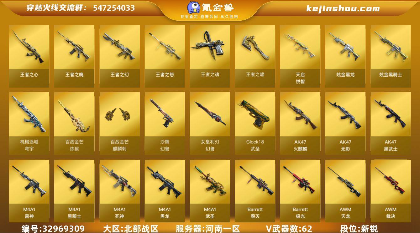 【ky6634】河南一区-63V-9王者武器数-2炫金武器数 【热门武器】:QBZ03-金色蔷薇*3,死亡之眼*2,M4A1-黑骑士*2,汤姆逊-烈龙*5,加特林-炼狱,沙鹰-修罗*2,高爆手雷-幻兽 【王者炫金武器】:天启-悦智,王者之幻,王者之魄,王者之心,王者之怒,王者之魂,王者之啸,炫金骑士,炫金黑龙 【音效卡】:屠龙-电竞之星-竞星跃动音效卡,Barrett-毁灭音效卡,HK417-朱雀-电竞之星-竞星跃动音效卡,炼狱-百战金芒-庆典舞曲音效卡,柯尔特-百战金芒-庆典舞曲音效卡 【皮肤】:雷神-能量核心,雷神-星空,M4A1-再燃火线,毁灭-暗月*2,黑骑士-暗月,无影-暗月,死神-秘银,天启-暗月*2,天龙-秘银*2,极光-能量核心,修罗-能量核心,修罗-百战金芒 皮肤,天神-暗月,轻型军用手斧-再燃火线 【角色】:零·纪元,王者-零,王者之瞳,乔伊教练,葵-阿尔法武装,幻面灵狐,娟娟,龙儿,龙儿-小淘气,麻雀,蜀雪,兔囡囡,团团 【人偶武器】:火麒麟-灵狐,AWM-灵狐-15周年嘉年华,生化手雷-机甲核心 【暴走生化】:死亡之眼*2 【挑战大师】:激光毁灭者III 【英雄级武器】:AK47-火麒麟*2,M4A1-黑龙,M4A1-雷神*8,M4A1-黑骑士*2,AK47-无影,M4A1-死神,AK47-黑武士,AN94-超新星,M4...