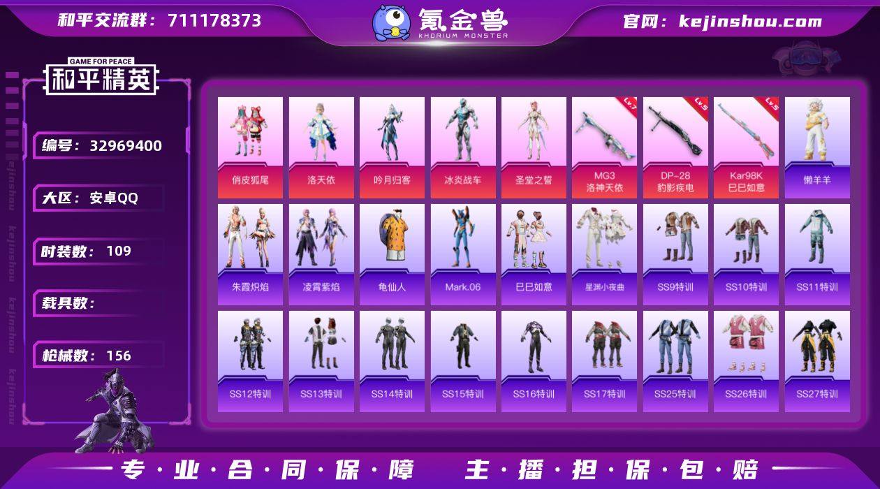 安卓【小号 角色-洛天依/套装-龟仙人/角色-Mark.06/Kar98K-巳巳如意(五级)/DP-28-豹影疾电(五级)/MG3-洛神天依(七级)】 手Q-5粉装-3特效枪-0载具-2粉色飞行器-45127热力值-2王牌印记-109套装-156枪皮 【热门品类】:套装-龟仙人,角色-Mark.06 【粉色套装】:粉装-俏皮狐尾,角色-洛天依,粉装-吟月归客,角色-冰炎战车,角色-圣堂之誓 【粉色枪皮等级】:Kar98K-巳巳如意(五级),DP-28-豹影疾电(五级),MG3-洛神天依(七级) 【粉色枪皮】:Kar98K-巳巳如意,DP-28-豹影疾电,MG3-洛神天依 【粉色飞行器】:齐天大圣飞行器,沙丘之主天马 【粉色降落伞】:甜蜜誓约降落伞,烈焰拳霸降落伞,恐龙拽拽降落伞,环太平洋降落伞,未来歌姬降落伞,萌物绒绒降落伞,超新星降落伞,莲影清波降落伞,彩装战姬降落伞,萌酷奶龙降落伞,熔岩统帅降落伞,圣堂之誓降落伞,月影灵韵降落伞,异瞳寒姬降落伞 【稀有套装】:套装-龟仙人,套装-巳巳如意,套装-迅捷龙虾,套装-星渊小夜曲,套装-朱霞炽焰,套装-凌霄紫焰,玩偶服-懒羊羊 【稀有枪皮】:AKM-夜灯,AKM-环太平洋,AKM-生命誓言,AKM-破晓战魂,AKM-萌趣颜团子,AKM-虎虎生威,AKM-龙的传人,M16A4-夜灯,M16A4-幻世战舞者,M16A4-...