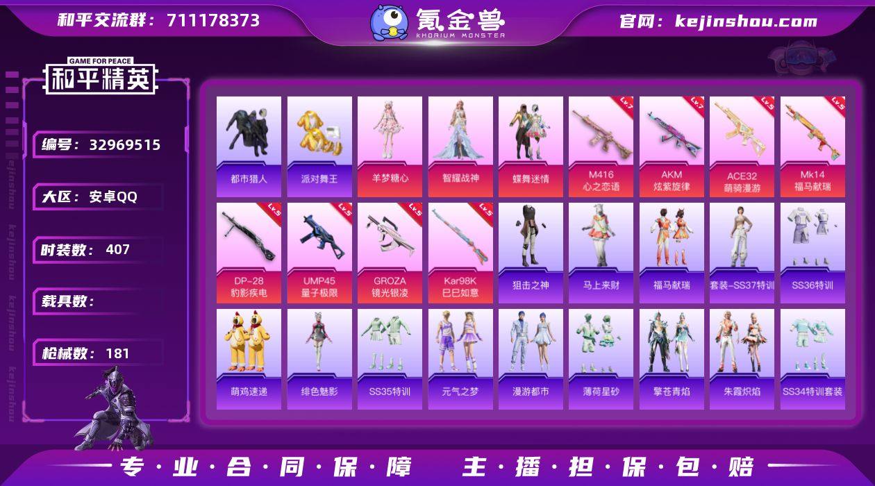 【主播推荐】实名: 不可修改 时装数: 407 枪械数: 181 战备数: 117 热门装扮: 蝶舞迷情,鹰眼刺客,都市猎人,派对舞王,智耀战神,羊梦糖心 稀有枪皮: AKM炫紫旋律,M416心之恋语,UMP45量子极限,GROZA-镜光银凌,Kar98K-巳巳如意,DP-28-豹影疾电,ACE32-萌骑漫游