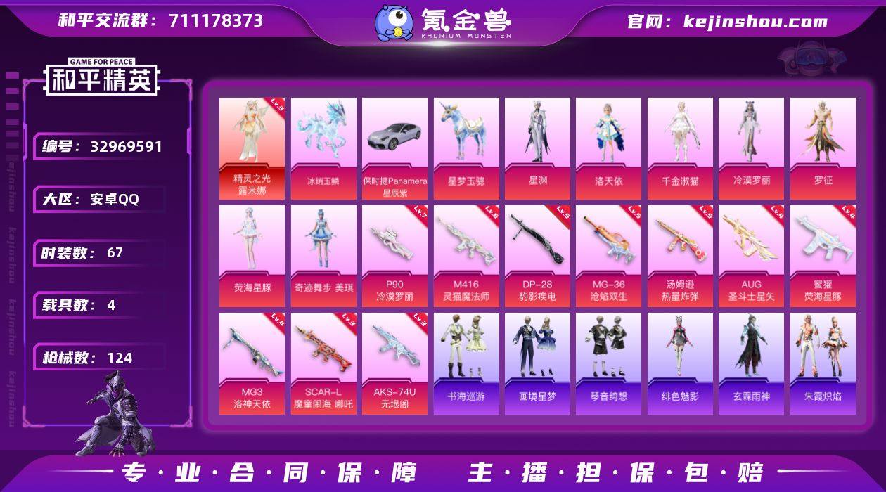 实名: 可修改 时装数: 67 载具数: 4 枪械数: 124 战备数: 95 神级装扮: 精灵之光-露米娜 热门装扮: 洛天依,千金淑猫,冷漠罗丽,罗征,荧海星豚,奇迹舞步-美琪,星渊 载具: 星梦玉骢,保时捷Panamera(星辰紫),冰绡玉鳞 稀有枪皮: MG3洛神天依,AUG-圣斗士星矢,P90-冷漠罗丽,汤姆逊-热量炸弹,蜜獾-荧海星豚,M416-灵猫魔法师,AKS-74U-无垠阁,DP-28-豹影疾电,SCAR-L-魔童闹海 哪吒,MG-36-沧焰双生 亮点: 安卓【红装号 暮色玫影-艾丽娅(一级)/精灵之光-露米娜(三级)/AKM-暮色玫影(六级)/SCAR-L-魔童闹海 哪吒(三级)/M416-灵猫魔法师(六级)/AUG-圣斗士星矢(四级)/角色-洛天依/角色-千金淑猫/保时捷Panamera(星辰紫)/萌熊伴侣背包】 手Q-2神装-8粉装-16特效枪-4载具-10粉色飞行器-54647热力值-5王牌印记-67套装-124枪皮【红色神装等级】:暮色玫影-艾丽娅(一级),精灵之光-露米娜(三级)【红色角色神装】:暮色玫影-艾丽娅,精灵之光-露米娜【热门品类】:套装-浪漫天命【粉色套装】:角色-洛天依,角色-千金淑猫,角色-冷漠罗丽,角色-罗征,角色-荧海星豚,角色-奇迹舞步 美琪,角色-星渊【粉色枪皮等级】:AKM-暮色玫影(六级),SCAR-L-魔童闹海 哪吒(三级),M416-灵猫魔法师(六级),AU...