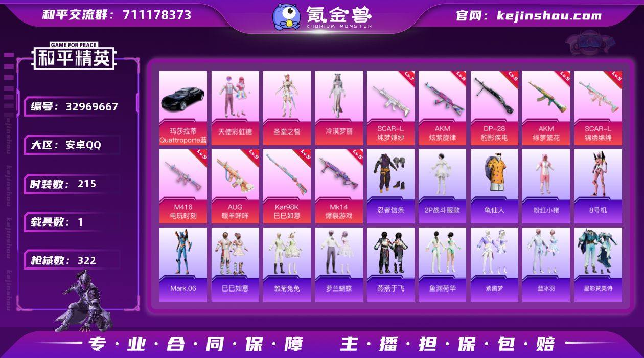 安卓 手Q-3粉装-12特效枪-1载具-1粉色飞行器-95224热力值-19王牌印记-215套装-322枪皮 【热门品类】:套装-忍者信条,角色-2P战斗服款,套装-龟仙人,套装-粉红小猪,角色-8号机,角色-Mark.06 【粉色套装】:粉装-天使彩虹糖,角色-圣堂之誓,角色-冷漠罗丽 【粉色枪皮等级】:AKM-炫紫旋律(六级),AKM-绿萝繁花(五级),SCAR-L-纯梦嫁纱(七级),SCAR-L-锦绣绵绵(五级),M416-电玩时刻(五级),AUG-暖羊咩咩(五级),AKS-74U-森灵之息(五级),Kar98K-巳巳如意(五级),Mk14-爆裂游戏(五级),Mk14-福马献瑞(五级),DP-28-豹影疾电(五级),PKM-萌骑夺宝(三级) 【粉色载具】:玛莎拉蒂Quattroporte(夜幕蓝) 【粉色枪皮】:AKM-炫紫旋律,AKM-绿萝繁花,SCAR-L-纯梦嫁纱,SCAR-L-锦绣绵绵,M416-电玩时刻,AUG-暖羊咩咩,AKS-74U-森灵之息,Kar98K-巳巳如意,Mk14-爆裂游戏,Mk14-福马献瑞,DP-28-豹影疾电,PKM-萌骑夺宝 【粉色飞行器】:极意拳锋飞行器 【粉色降落伞】:极限特训降落伞,幻影战神降落伞,百万伏特降落伞,甜心宝贝降落伞,至尊龙雀降落伞,神秘黑猫降落伞,四圣焕新降落伞,梦之光华降落伞,风花雪月降落伞,暖熊萌萌降落伞,纯梦嫁纱降落伞,未来歌姬降落伞,超...
