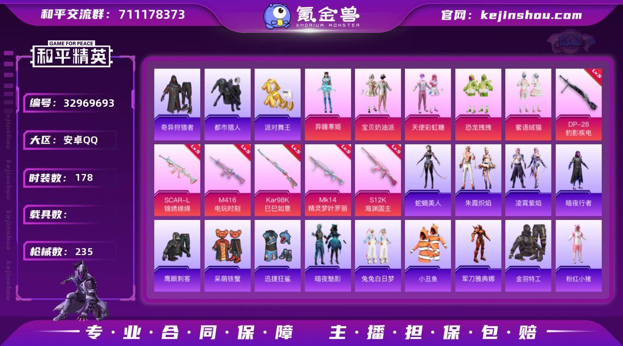 安卓【小号 套装-都市猎人,套装-派对舞王,套装-金羽特工,角色-8号机,角色-Mark.06,SCAR-L-锦绣绵绵(五级),M416-电玩时刻(五级),Kar98K-巳巳如意(五级)】 手Q-5粉装-6特效枪-0载具-4粉色飞行器-67826热力值-9王牌印记-178套装-235枪皮 【热门品类】:套装-都市猎人,套装-派对舞王,套装-小丑鱼,套装-奇异狩猎者,角色-军刀雅典娜,套装-金羽特工,套装-暗夜行者,套装-粉红小猪,角色-8号机,角色-Mark.06 【粉色套装】:粉装-宝贝奶油派,粉装-天使彩虹糖,粉装-恐龙拽拽,粉装-蜜语绒猫,角色-异瞳寒姬 【粉色枪皮等级】:SCAR-L-锦绣绵绵(五级),M416-电玩时刻(五级),Kar98K-巳巳如意(五级),Mk14-精灵梦叶罗丽(五级),S12K-海渊国主(五级),DP-28-豹影疾电(五级) 【粉色枪皮】:SCAR-L-锦绣绵绵,M416-电玩时刻,Kar98K-巳巳如意,Mk14-精灵梦叶罗丽,S12K-海渊国主,DP-28-豹影疾电 【粉色飞行器】:炫彩糖果飞行器,拂晓神骑飞行器,鎏金朋克飞行器,墨金战记飞行器 【粉色降落伞】:甜心宝贝降落伞,梦幻火箭降落伞,暗夜玫瑰降落伞,海渊国主降落伞,蓝莓炮弹降落伞,碧影闪光降落伞,橘柚倾心降落伞,太空嘟嘟降落伞,彩虹甜喵降落伞,旋转彩虹降落伞,精灵...