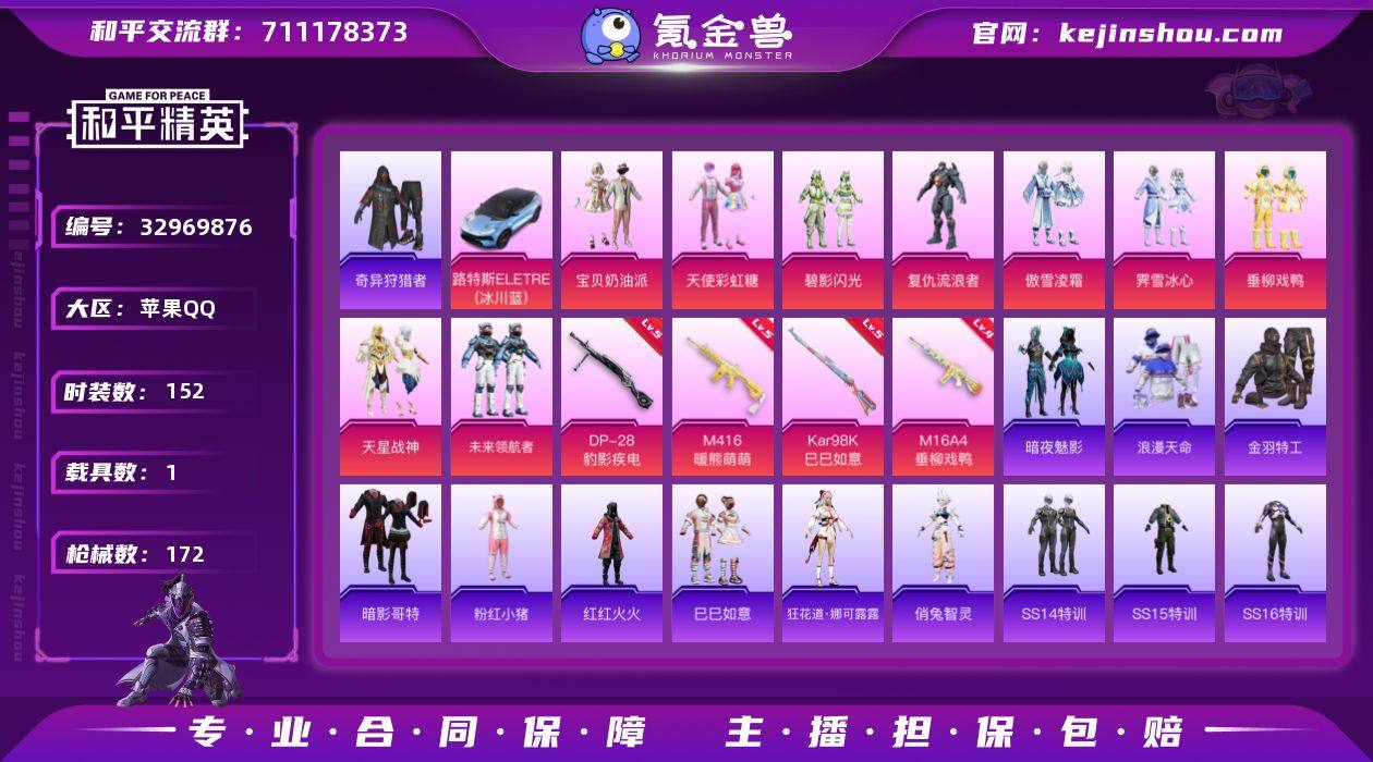 苹果 手Q-9粉装-4特效枪-1载具-3粉色飞行器-57067热力值-8王牌印记-152套装-172枪皮 【热门品类】:套装-浪漫天命,套装-奇异狩猎者,套装-金羽特工,套装-暗影哥特,套装-粉红小猪,套装-红红火火 【粉色套装】:粉装-宝贝奶油派,粉装-天使彩虹糖,粉装-碧影闪光,角色-复仇流浪者,粉装-傲雪凌霜,粉装-霁雪冰心,粉装-垂柳戏鸭,粉装-天星战神,粉装-未来领航者 【粉色枪皮等级】:M16A4-垂柳戏鸭(四级),M416-暖熊萌萌(五级),Kar98K-巳巳如意(五级),DP-28-豹影疾电(五级) 【粉色载具】:路特斯ELETRE(冰川蓝) 【粉色枪皮】:M16A4-垂柳戏鸭,M416-暖熊萌萌,Kar98K-巳巳如意,DP-28-豹影疾电 【粉色飞行器】:炫彩糖果飞行器,暖熊萌萌飞行器,深渊漩涡飞行器 【粉色降落伞】:甜心宝贝降落伞,梦幻火箭降落伞,银刃赛罗降落伞,烈焰拳霸降落伞,恐龙拽拽降落伞,妙趣可丽降落伞,环太平洋降落伞,暖熊萌萌降落伞,垂柳戏鸭降落伞,宇宙意志降落伞,拳皇·狂花道降落伞,炫彩糖果降落伞 【稀有套装】:套装-巳巳如意,套装-雪国风尚,套装-炫彩糖果,角色-狂花道·娜可露露,角色-俏兔智灵 【稀有枪皮】:AKM-奇异狩猎者,AKM-彩虹符号,AKM-灼热熔岩,AKM-破晓战魂,A...