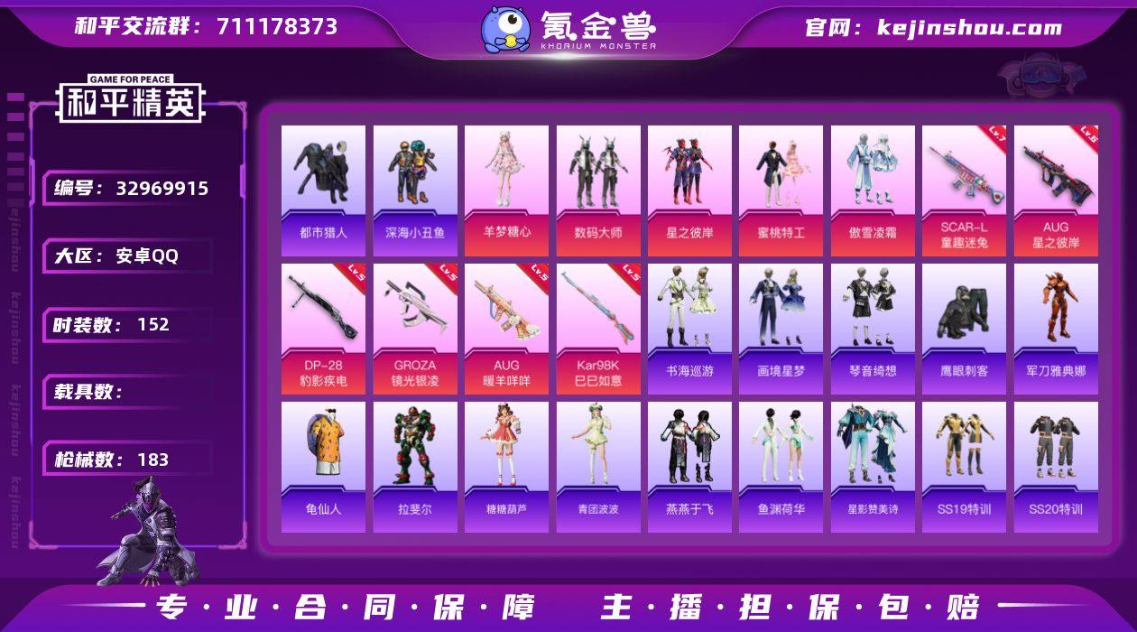 安卓 手Q-5粉装-9特效枪-0载具-1粉色飞行器-54323热力值-10王牌印记-152套装-183枪皮 【热门品类】:套装-都市猎人,套装-深海小丑鱼,角色-军刀雅典娜,套装-龟仙人 【粉色套装】:粉装-数码大师,粉装-星之彼岸,粉装-蜜桃特工,粉装-傲雪凌霜,角色-羊梦糖心 【粉色枪皮等级】:SCAR-L-童趣迷兔(七级),GROZA-镜光银凌(五级),AUG-星之彼岸(六级),AUG-暖羊咩咩(五级),ACE32-萌骑漫游(二级),AKS-74U-森灵之息(五级),Kar98K-巳巳如意(五级),Mk14-福马献瑞(五级),DP-28-豹影疾电(五级) 【粉色枪皮】:SCAR-L-童趣迷兔,GROZA-镜光银凌,AUG-星之彼岸,AUG-暖羊咩咩,ACE32-萌骑漫游,AKS-74U-森灵之息,Kar98K-巳巳如意,Mk14-福马献瑞,DP-28-豹影疾电 【粉色飞行器】:炫彩糖果飞行器 【粉色降落伞】:未来战士降落伞,炙焰牛王降落伞,环太平洋降落伞,垂柳戏鸭降落伞,太空嘟嘟降落伞,彩虹甜喵降落伞,旋转彩虹降落伞,雪月幻音降落伞,异瞳寒姬降落伞,炫彩糖果降落伞 【稀有套装】:套装-龟仙人,套装-雪国风尚,套装-炫彩糖果,套装-马上有钱,角色-拉斐尔,套装-糖糖葫芦,套装-青团波波,套装-燕燕于飞,套装-鱼渊荷华,套装-星影赞美诗,套装-书海巡游,套装...