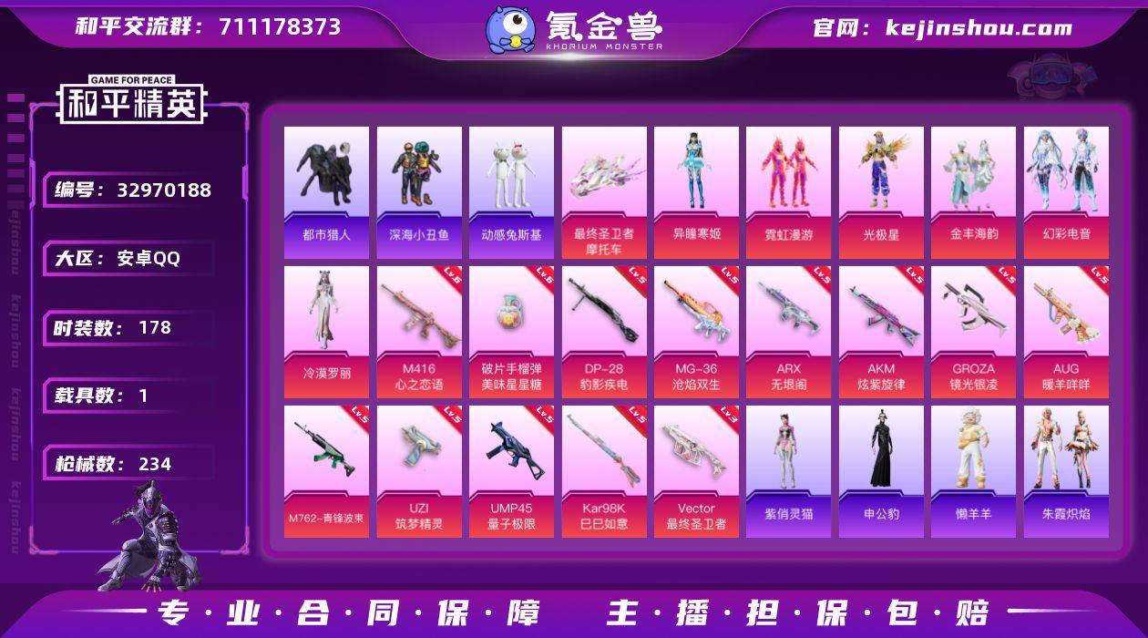 安卓 手Q-6粉装-15特效枪-1载具-3粉色飞行器-81131热力值-13王牌印记-178套装-234枪皮 【热门品类】:套装-浪漫天命,套装-都市猎人,套装-深海小丑鱼,套装-动感兔斯基人偶服,套装-AG战队服,套装-龟仙人,套装-暗影哥特,角色-Mark.06 【粉色套装】:粉装-霓虹漫游,角色-光极星,粉装-金丰海韵,粉装-幻彩电音,角色-冷漠罗丽,角色-异瞳寒姬 【粉色枪皮等级】:AKM-炫紫旋律(五级),M416-心之恋语(六级),GROZA-镜光银凌(五级),AUG-暖羊咩咩(五级),M762-青锋波束(五级),ARX-无垠阁(五级),UZI-筑梦精灵(五级),UMP45-量子极限(五级),Vector-最终圣卫者(三级),AKS-74U-森灵之息(四级),Kar98K-巳巳如意(五级),AA12-G-萌骑幻想(四级),DP-28-豹影疾电(五级),MG-36-沧焰双生(五级),破片手榴弹-美味星星糖(六级) 【粉色载具】:最终圣卫者摩托车 【粉色枪皮】:AKM-炫紫旋律,M416-心之恋语,GROZA-镜光银凌,AUG-暖羊咩咩,M762-青锋波束,ARX-无垠阁,UZI-筑梦精灵,UMP45-量子极限,Vector-最终圣卫者,AKS-74U-森灵之息,Kar98K-巳巳如意,AA12-G-萌骑幻想,DP-28-豹影疾电,MG-36-沧焰双生,破片手榴弹-美味星星糖 【粉色飞行器】:霓虹漫游飞行器,深渊漩涡飞...