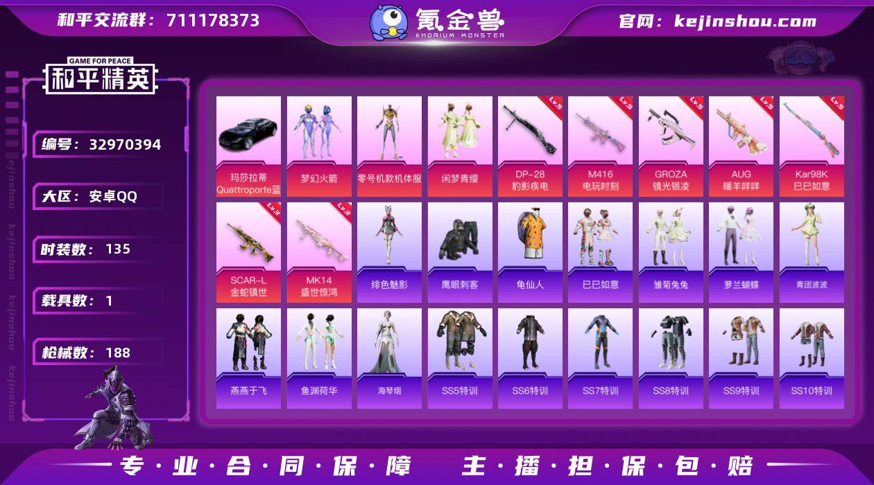 安卓 【素材号 粉装-梦幻火箭/绝对防御上衣/角色-零号机款机体服/SCAR-L-金蛇镇世(三级)/M416-电玩时刻(五级)/UG-暖羊咩咩(五级)/玛莎拉蒂Quattroporte(夜幕蓝)】手Q-3粉装-7特效枪-1载具-4粉色飞行器-57198热力值-15王牌印记-135套装-188枪皮 【热门品类】:粉装-梦幻火箭,绝对防御上衣,套装-龟仙人 【粉色套装】:粉装-梦幻火箭,角色-零号机款机体服,粉装-闲梦青缨 【粉色枪皮等级】:SCAR-L-金蛇镇世(三级),M416-电玩时刻(五级),GROZA-镜光银凌(五级),AUG-暖羊咩咩(五级),Kar98K-巳巳如意(五级),Mk14-盛世惊鸿(三级),DP-28-豹影疾电(五级) 【粉色载具】:玛莎拉蒂Quattroporte(夜幕蓝) 【粉色枪皮】:SCAR-L-金蛇镇世,M416-电玩时刻,GROZA-镜光银凌,AUG-暖羊咩咩,Kar98K-巳巳如意,Mk14-盛世惊鸿,DP-28-豹影疾电 【粉色飞行器】:酣梦熊熊飞行器,梦幻火箭飞行器,凤舞九天飞行器,万象金身飞行器 【粉色降落伞】:梦幻火箭降落伞,银刃赛罗降落伞,未来歌姬降落伞,盛世惊鸿降落伞,鬼刀降落伞 【稀有套装】:套装-龟仙人,套装-巳巳如意,套装-雏菊兔兔,套装-萝兰蝴蝶,套装-青团波波,套装-燕燕于飞,套装-鱼渊荷华,角色-海琴烟,角色-绯色魅影 【...