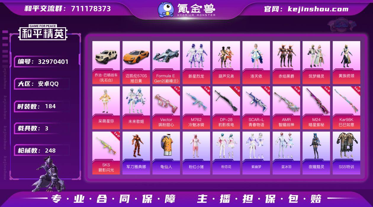 安卓 手Q-8粉装-9特效枪-3载具-3粉色飞行器-79430热力值-4王牌印记-184套装-248枪皮 【热门品类】:角色-军刀雅典娜,套装-龟仙人,套装-粉红小猪 【粉色套装】:粉装-新星烈龙,粉装-葫芦兄弟,角色-洛天依,粉装-赤焰黑爵,粉装-筑梦精灵,粉装-黄族统领,角色-呆萌星弥,粉装-未来歌姬 【粉色枪皮等级】:SCAR-L-青春物语(五级),M762-冷魅冰骑(六级),Vector-飒粉甜心(七级),Kar98K-巳巳如意(二级),M24-暗星紫秘(四级),SKS-碧影闪光(二级),Mk14-福马献瑞(四级),AMR-智耀战神(五级),DP-28-豹影疾电(五级) 【粉色载具】:乔治巴顿战车(乳石白),迈凯伦570S(旭日黄),Formula E Gen2(巅峰兰) 【粉色枪皮】:SCAR-L-青春物语,M762-冷魅冰骑,Vector-飒粉甜心,Kar98K-巳巳如意,M24-暗星紫秘,SKS-碧影闪光,Mk14-福马献瑞,AMR-智耀战神,DP-28-豹影疾电 【粉色飞行器】:炫彩糖果飞行器,星夜魔法师飞行翼,极意拳锋飞行器 【粉色降落伞】:快乐主宰降落伞,香水柠檬降落伞,暗夜玫瑰降落伞,蓝莓炮弹降落伞,暗星紫秘降落伞,炙焰牛王降落伞,环太平洋降落伞,第五大道降落伞,龙珠超降落伞,白勺歌姬降落伞,炫光之旅降落伞,莲影清波降落伞,炫彩糖果降落伞...