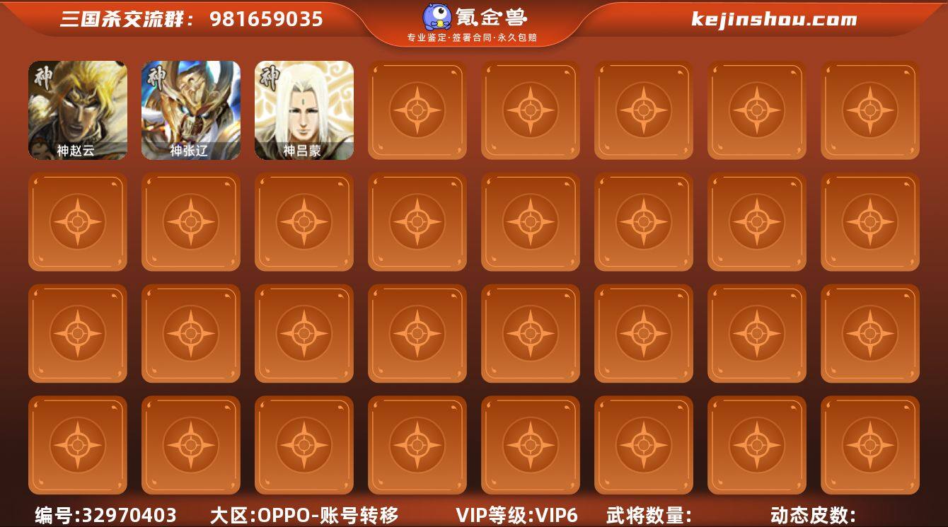 VIP等级:VIP6 卖家说:史诗武将巨多,史诗皮肤也多,动态皮肤也有很多七夕节限定就是神武将有点少,三个神武将。号是玩了10年,标骑将军一等,马上升大将军了,要的话可以小刀