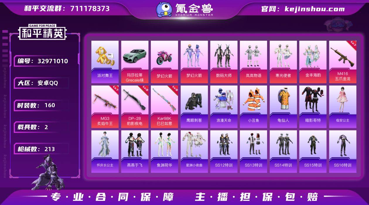 安卓【小号 粉装-梦幻火箭,套装-浪漫天命,套装-派对舞王,套装-暗影哥特,M416-五爪金龙(七级),Kar98K-巳巳如意(五级),玛莎拉蒂Grecale(薄荷绿),双人摩托-梦幻火箭,百万伏特背包(1级)】 手Q-5粉装-5特效枪-2载具-1粉色飞行器-63577热力值-11王牌印记-160套装-213枪皮 【热门品类】:粉装-梦幻火箭,套装-浪漫天命,套装-派对舞王,套装-小丑鱼,套装-龟仙人,套装-暗影哥特 【粉色套装】:粉装-数码大师,粉装-梦幻火箭,粉装-岚岚物语,粉装-寒光使者,粉装-金丰海韵 【粉色枪皮等级】:M416-五爪金龙(七级),Kar98K-巳巳如意(五级),AA12-G-萌骑幻想(五级),DP-28-豹影疾电(五级),MG3-炙焰牛王(七级) 【粉色载具】:玛莎拉蒂Grecale(薄荷绿),双人摩托-梦幻火箭 【粉色枪皮】:M416-五爪金龙,Kar98K-巳巳如意,AA12-G-萌骑幻想,DP-28-豹影疾电,MG3-炙焰牛王 【粉色飞行器】:梦幻火箭飞行器 【粉色降落伞】:百万伏特降落伞,甜心宝贝降落伞,梦幻火箭降落伞,金风玉露降落伞,洛神天依降落伞,星夜魔法师降落伞,垂柳戏鸭降落伞,暗夜鎏金降落伞,未来歌姬降落伞,江南烟雨降落伞,临安公主降落伞,霜月狼主降落伞 【稀有套装】:套装-龟仙人,角色-幸运青,...