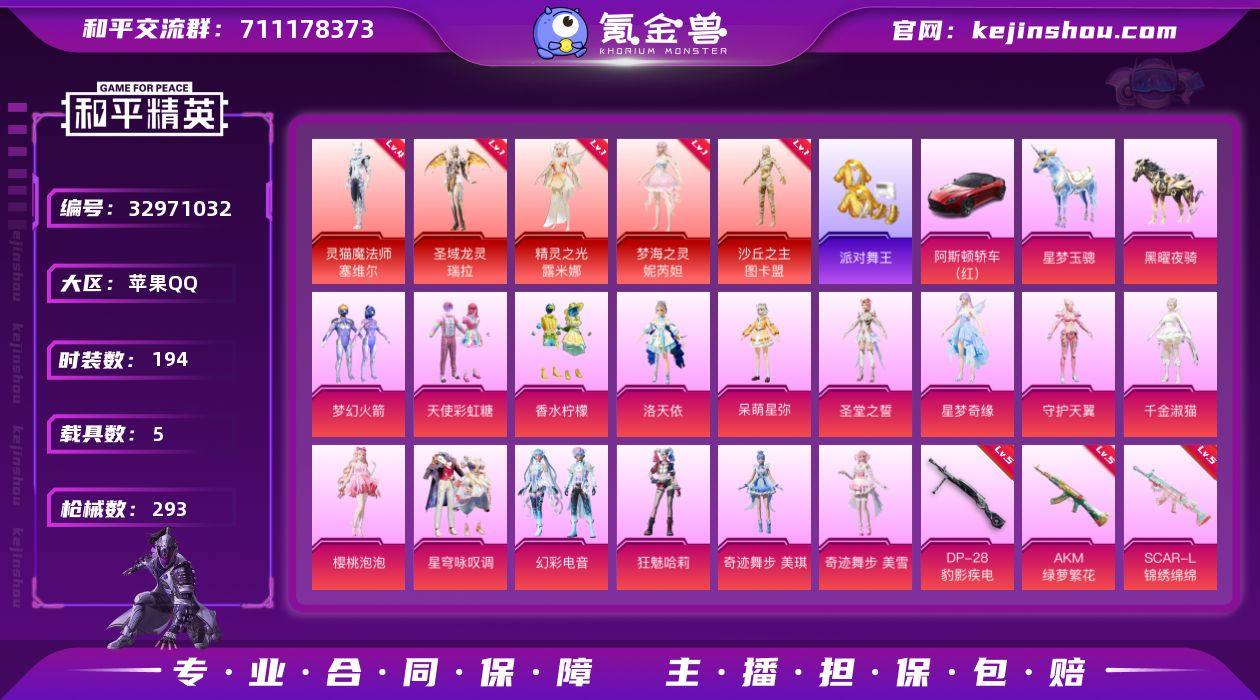 实名: 不可修改 时装数: 194 载具数: 5 枪械数: 293 战备数: 225 神级装扮: 沙丘之主-图卡盟,梦海之灵-妮芮妲,精灵之光-露米娜,圣域龙灵-瑞拉,灵猫魔法师-塞维尔 热门装扮: 梦幻火箭(新101),天使彩虹糖,香水柠檬,洛天依,派对舞王,呆萌星弥,圣堂之誓,星梦奇缘,守护天翼,千金淑猫,樱桃泡泡,星穹咏叹调,幻彩电音,狂魅哈莉,奇迹舞步-美雪,奇迹舞步-美琪 载具: 阿斯顿·马丁DBS(红),空客H135-蔚蓝之翼,星梦玉骢,黑曜夜骑 稀有枪皮: MG3洛神天依,AKM甜心宝贝,AKM绿萝繁花,SCAR-L-锦绣绵绵,M24镜域双华,M416电玩时刻,M416墨龙九天,M200梦海之灵,AUG星梦奇缘,GROZA-精灵之光,Kar98K-巳巳如意,Kar98K-圣域龙灵,AMR-智耀战神,破片手榴弹-瓶中星球,AKS-74U-星穹咏叹调,MK14-甜梦熊击,烟雾弹-甜梦果泡,M416-灵猫魔法师,Vector-绯穹魔姬,DP-28-豹影疾电,SCAR-L-魔童闹海 哪吒 亮点: 苹果【极品神装号 暮色玫影-艾丽娅(一级)/灵猫魔法师-塞维尔(四级)/圣域龙灵-瑞拉(一级)/精灵之光-露米娜(一级)/梦海之灵-妮芮妲(一级)/沙丘之主-图卡盟(一级) /SCAR-L-锦绣绵绵(五级)/SCAR-L-魔童闹海 哪吒(三级)/M416-电玩时刻(五级)/M416-墨龙九天(一级)/M416-灵猫魔法师(三级)/GROZA-精灵之光(三级)/粉装-...