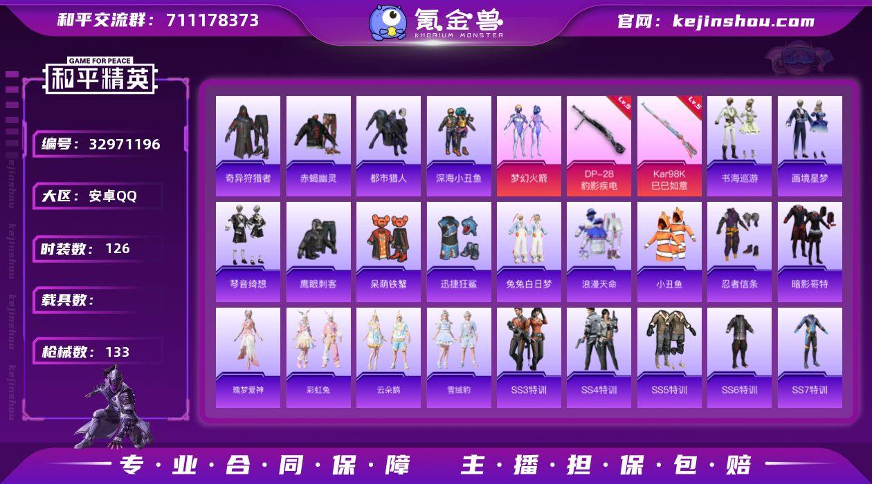 安卓【素材号 梦幻火箭/浪漫天命/赤蝎幽灵/都市猎人/深海小丑鱼 /暗影哥特 /奇异狩猎者 /梦幻火箭背包】 手Q-1粉装-2特效枪-0载具-0粉色飞行器-38285热力值-3王牌印记-126套装-133枪皮 【热门品类】:粉装-梦幻火箭,套装-浪漫天命,套装-赤蝎幽灵,套装-都市猎人,套装-深海小丑鱼,套装-小丑鱼,套装-奇异狩猎者,套装-忍者信条,套装-SS1特训,套装-暗影哥特 【粉色套装】:粉装-梦幻火箭 【粉色枪皮等级】:Kar98K-巳巳如意(五级),DP-28-豹影疾电(五级) 【粉色枪皮】:Kar98K-巳巳如意,DP-28-豹影疾电 【粉色降落伞】:梦幻火箭降落伞,蜜语绒猫降落伞,星穹咏叹调降落伞,炫彩糖果降落伞 【稀有套装】:套装-马上有钱,角色-瑰梦爱神,套装-彩虹兔,套装-云朵鹅,套装-雪绒豹,套装-书海巡游,套装-画境星梦,套装-琴音绮想,套装-雨过天青,套装-红釉青花 【稀有枪皮】:AKM-影袭,AKM-生命誓言,AKM-破晓战魂,AKM-缤纷海域,M16A4-红色方程式,SCAR-L-夜灯,SCAR-L-玉兔迎春,SCAR-L-红色方程式,M416-糯团青竹,M416-红色方程式,M416-蓝色火焰,GROZA-黑色刀锋,AUG-幻影战神,QBZ-彩虹符号,M762-牛气冲天,M762-云朵鹅,G36C-荒野猎神,AC-VAL-天降萌叽,AC-VAL...