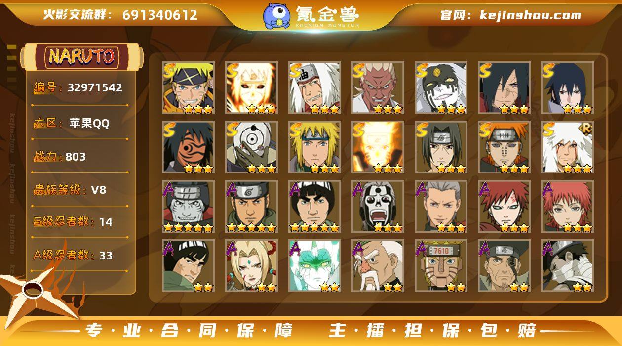 V8 803万战力 14S-33A 卡卡西53片 止水65片 金式97片 LL5612 【S级忍者】:宇智波斑「秽土转生·解」(3星),艾「忍界大战」(3星),宇智波鼬「须佐能乎」(3星),自来也「舞之豪杰」(3星),自来也「传说中的三忍」(3星),波风水门(3星),神秘面具男「红夜之刃」(3星),漩涡鸣人「九喇嘛连结」(3星),佩恩「天道」(3星),宇智波佐助「永恒万花筒」(3星),宇智波斑 「白面具」(3星宇智波斑「白面具」),大筒木桃式(3星),波风水门「九喇嘛连结」(3星),漩涡鸣人·宇智波佐助(3星) 【A级忍者】:艾「青年」(2星),长门「青年」(2星),波风水门「青年」(2星),迪达拉(2星),飞段(3星),飞段「死司凭血」(3星),干柿鬼鲛(5星),漩涡博人「桃式显现」(2星),机械鸣人「初始形态」(2星),迈特凯(5星),旗木卡卡西「幻之真容」(2星),桃地再不斩「秽土转生」(2星),我爱罗「疾风传」(3星),蝎(3星),猿飞阿斯玛(5星),宇智波鼬(2星),宇智波佐助「须佐能乎」(2星),照美冥「五代目水影」(2星),日向宁次「忍界大战」(2星),长十郎「六代目水影」(2星),李洛克「忍界大战」(2星),黑土「博人传」(2星),春野樱「百豪」(2星),秋道丁次「忍界大战」(2星),千代「近松十人卫」(2星),神农「羁...