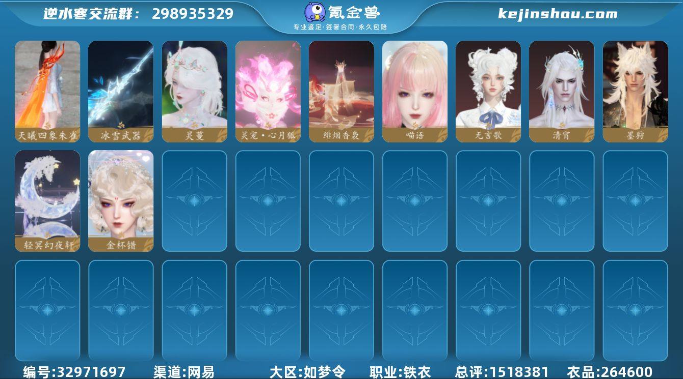【区服】 仲夏绮梦 【战力值】 177.62 【职业】 铁衣 【馆藏】 5级 【衣品值】 264600 【国色值】 79300 【已用天赏石】 16 【天霓染数量】 1 【充值称号】 把酒临风 【累计充值】 18414元 【天霓染】 时隙旅者*1 【灵韵内功】 揽狂风, 鸣沙诀, 斩焰诀, 止水诀, 昆吾断玉, 通微, 荡剑扬波 【副本外观】 白夜拂雪*3, 星剑分野, 芜心照雪, 霜途无间, 飞焰流波, 紫宿宸极 【天赏外观】 灵蔓, 无言歌, 墨狩, 清宵, 喵语, 金杯错, 冰雪武器, 绯烟香袅, 天曦四象·朱雀 【天赏祥瑞】 轻冥幻夜轩 【祥瑞坐骑】 萌莓, 布丁, 假面, 鸿火, 风行·江湖景, 风行·世间情, 风行·万灯明, 呆宝, 云螭·金玉纳福, 云螭·封冰怀雪, 云螭·烹鲜炊黍, 龙衔瑞焰, 金冠鼠鼠, 纵风甲车·赤, 幻琉晶, 狂霸天, 秋霜橘, 沉木行马, 星河转·金夕, 甜点鼠鼠, 伯力, 咩郎, 霸霸, 墨流云·玄色, 墨流云·靛青, 奔虹赤, 踏星夜, 彩虹小马, 木小马, 云络, 鱼逢岁禧, 鱼曳金霞, 银砂素波, 犬威哮月, 犬威哮月·焰, 玉霄飞练, 梅香团子, 绒绒夜, 桃桃雪, 朵朵公主, 牛奶酥, 隐云涧, 犬威哮月·沧, 侠道游, 逍遥游 【商城外观】 雪庭问宋, 墨喧雪绒, 夜雪闻梅, 金缕漠歌, 夜锋漫迹, 甜宙漫游, 时隙旅者, 雾蓝星瞳, 纯白月光,...
