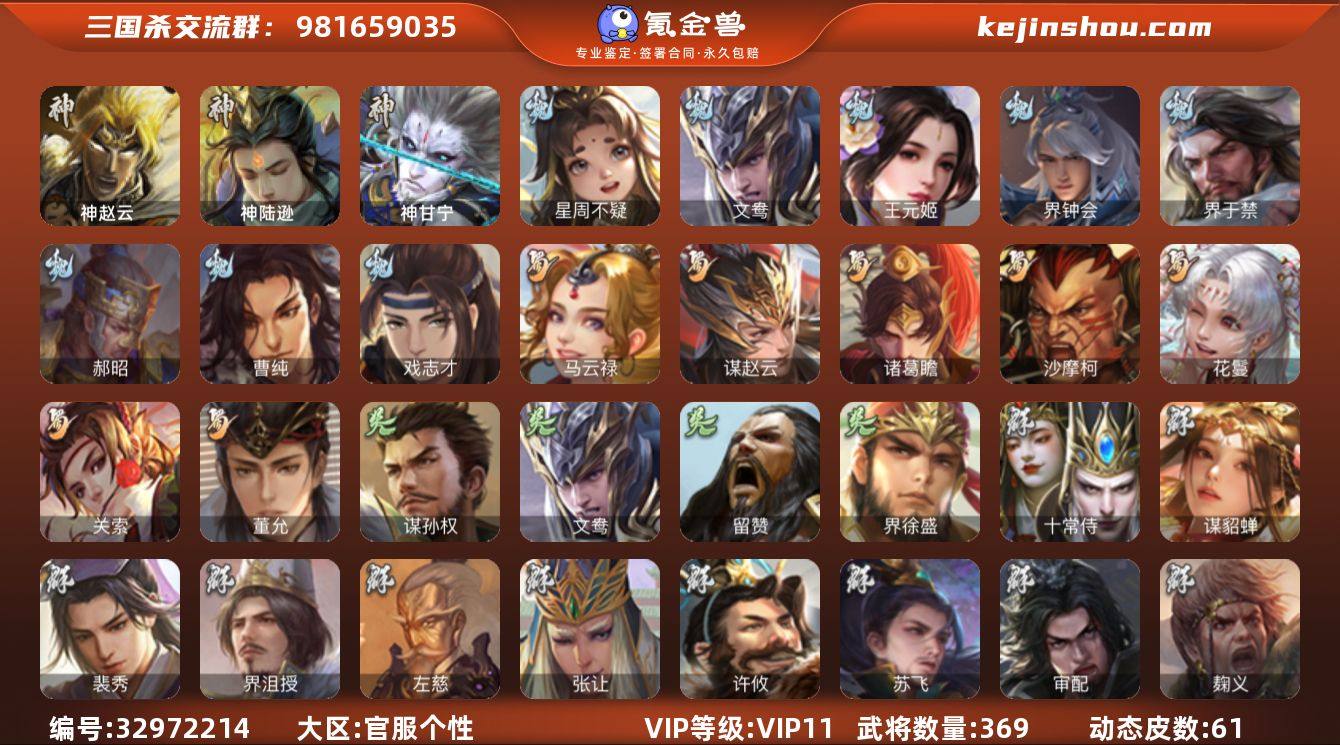【427】官阶:大将军;VIP等级:VIP11;史诗武将数量:37;动态皮肤数量:61;武将总数:369;史诗宝珠数量:11;将魂数量:666;神将:5;魏国史诗武将:15;蜀国史诗武将:7;吴国史诗武将:3;群史诗武将:19 神赵云,神陆逊,神甘宁,神吕蒙,神周瑜,星周不疑,文鸯,王元姬,界钟会,界于禁,郝昭,曹纯,戏志才,关索,马云騄,谋赵云,诸葛瞻,沙摩柯,花鬘,董允,留赞,界徐盛,谋孙权,谋黄月英,谋荀彧,十常侍,谋貂蝉,裴秀,界沮授,左慈,张让,苏飞,审配,麹义,南华老仙,沮授,界左慈,界李儒,鲍信,阎象,许攸,陈珪,神张辽-威震江东,神刘备-龙兴海内,神甘宁-万人辟易(动态),神曹操-天下归心,神赵云-战龙在野(动态),曹丕-气荡山河(动态),星周不疑-龙年清明(动态),甄姬-明珠耀躯(动态),SP蔡文姬-兔年冬日(动态),张春华-雪中舞刃(动态),戏志才-举棋若定(动态),朱灵-以战破氐(动态),王元姬-鼠年冬至(动态),花鬘-依心缱绻(动态),诸葛亮-龙年限定(动态),费祎-安民护祚(动态),关索-依心缱绻(动态),沙摩柯-劲弩始发(动态),关羽-明良千古(动态),赵云-牛年春节(动态),诸葛瞻-绵竹之殇(动态),界赵云-牛年春节(动态),孙策-兔年中秋(动态),周处-义除三害(动态),吕蒙-剑起惊澜(动态),孙权-永开吴祚(动态),文鸯-破宇开...