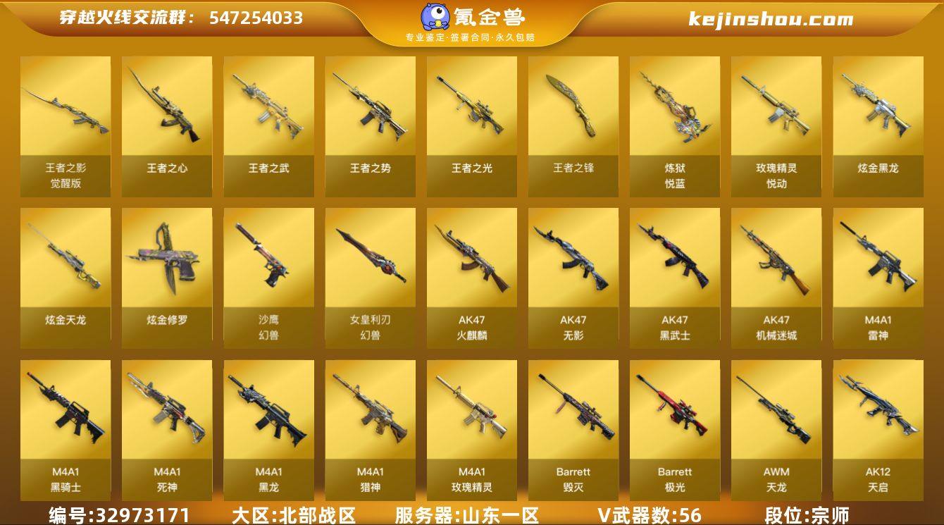 【ky6640】山东一区-58V-14王者武器数-3炫金武器数 【热门武器】:QBZ03-金色蔷薇,M4A1-黑骑士*3,汤姆逊-烈龙*5,沙鹰-修罗*4,高爆手雷-幻兽*2 【王者炫金武器】:王者之势,王者之武,玫瑰精灵-悦动,王者之心,王者之光*2,炼狱-悦蓝*2,王者之锋*5,炫金黑龙,炫金天龙,炫金修罗 【皮肤】:雷神-暗月,雷神-能量核心,毁灭-魔灵皮肤,黑龙-暗月,黑骑士-暗月,无影-暗月,死神-秘银,天启-暗月*3,极光-能量核心,修罗-能量核心*3,天神-暗月*4 【角色】:樱,王者之瞳,兰-海滩派对,幽,团团 【人偶武器】:COP-旗袍,M4A1-刀锋,迷你深渊冰龙 【暴走生化】:超级对讲机 【挑战大师】:激光毁灭者III 【英雄级武器】:AK47-火麒麟*2,M4A1-黑龙,M4A1-雷神*2,M4A1-黑骑士*3,AK47-无影,M4A1-死神,AK47-黑武士,AK12-天启*3,AN94-超新星,AK47-机械迷城*4,M4A1-玫瑰精灵,QBZ03-金色蔷薇,M4A1-猎神,王者之影-觉醒版,AWM-天龙*4,Barrett-毁灭,Barrett-极光*3,Barrett-金色蔷薇,汤姆逊-烈龙*5,沙鹰-修罗*4,沙鹰-天神,沙鹰-幻兽*2,屠龙*2,龙啸,擎天*2,麒麟刺,女皇利刃-幻兽,高爆手雷-幻兽*2,闪光弹-幻兽*2,烟雾弹-幻兽*2 【其他武器】:魂·雷神-...