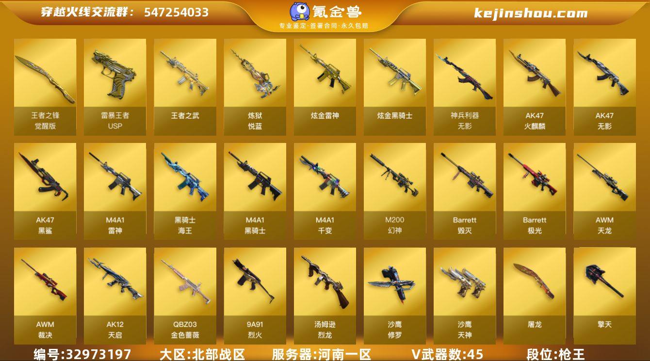 【ky6643】河南一区-48V-4王者武器数-2炫金武器数 【热门武器】:QBZ03-金色蔷薇*4,M200-幻神,死亡之眼,M4A1-黑骑士,汤姆逊-烈龙,沙鹰-修罗*2 【王者炫金武器】:王者之武,炼狱-悦蓝,USP-雷暴王者,炫金骑士,炫金雷神 【皮肤】:裁决-星际旅行 皮肤,雷神-能量核心,火麒麟-平天大圣,火麒麟-心动糖果,毁灭耀金皮肤*3,毁灭-英雄计划 皮肤,M4A1-千变-孔明皮肤,黑骑士耀金皮肤,屠龙-春桃 皮肤 【角色】:魅影,北极狐-X,初恋灵狐,风暴女,嘉年华灵狐,娟娟,兰-新年限定,灵狐-花神,潘多拉-X,潜龙队-X,斯沃特-X,蜀雪,樱-战斗天使,团团 【人偶武器】:AWM-灵狐-15周年嘉年华,迷你深渊冰龙,迷你牛魔王,迷你波特博士,生化手雷-机甲核心*3,深渊终结者手雷,灵狐娃娃手雷 【暴走生化】:死亡之眼,超级对讲机 【挑战大师】:AK47-冰龙粉碎者,激光毁灭者III-白马银枪,神圣爆裂者-末日III,阐释者III 【英雄级武器】:M4A1-千变,AK47-火麒麟*2,M4A1-雷神,M4A1-黑骑士,AK47-无影,AK12-天启*5,AK47-黑鲨,无影-神兵利器,QBZ03-金色蔷薇*4,9A91-烈火*2,黑骑士-海王*2,AWM-天龙*2,Barrett-毁灭,Barrett-极光,AWM-裁决*3,M200-幻神,汤姆逊-烈龙...