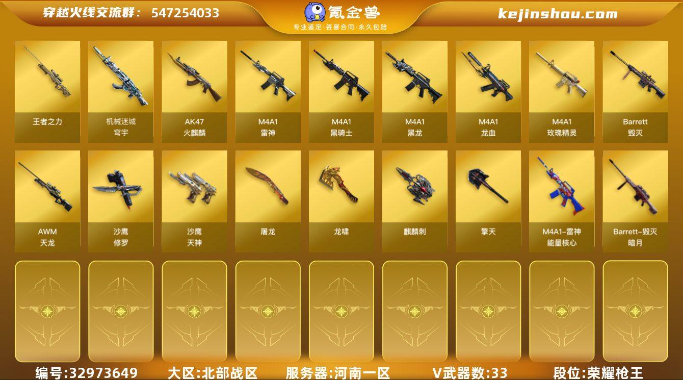 【ky6657】河南一区-33V-1王者武器数-0炫金武器数 【热门武器】:死亡之眼,M4A1-黑骑士*2,降世魔童,沙鹰-修罗*3 【王者炫金武器】:王者之力 【皮肤】:雷神-能量核心,毁灭-暗月,毁灭-虹光风暴 皮肤,毁灭-英雄计划 皮肤,天神-暗月 【角色】:云海玲珑,电竞少女,0号玩家,蛇姬,潘多拉-N 【人偶武器】:降世魔童 【暴走生化】:死亡之眼 【英雄级武器】:AK47-火麒麟,M4A1-黑龙,M4A1-雷神,M4A1-黑骑士*2,M4A1-龙血,M4A1-玫瑰精灵,机械迷城-穹宇,AWM-天龙,Barrett-毁灭*2,沙鹰-修罗*3,沙鹰-天神*2,屠龙*3,龙啸,擎天,麒麟刺*2,尼泊尔-雷霆,屠龙-斗烈龙驹,高爆手雷-雷霆,闪光弹-雷霆,烟雾弹-雷霆 【其他武器】:源·火麒麟,源·雷神*2,源·黑骑士,魂·黑骑士-破浪10年,御·超新星-圣诞*2,源·武圣,源·机械迷城,魂·龙血-锋芒破茧,魂·HK417-朱雀-凤灵,源·HK417-朱雀,魂·QBZ03-金色蔷薇-蛇姬,QBZ03-文殊坊,源·玫瑰精灵,魂·英雄-湾区光枢,源·天龙,魂·毁灭-神秘黑洞*2,魂·炼狱-电子连击,加特林-炼狱-掌火,魂·天神-宇航兔兔,灵·天神-穹宇,源·武圣glock,魂·擎天-破浪10年,灵·麒麟刺-穹宇 【道具】:BS战队炫彩背包,CFS限定背包,战舰背包,...