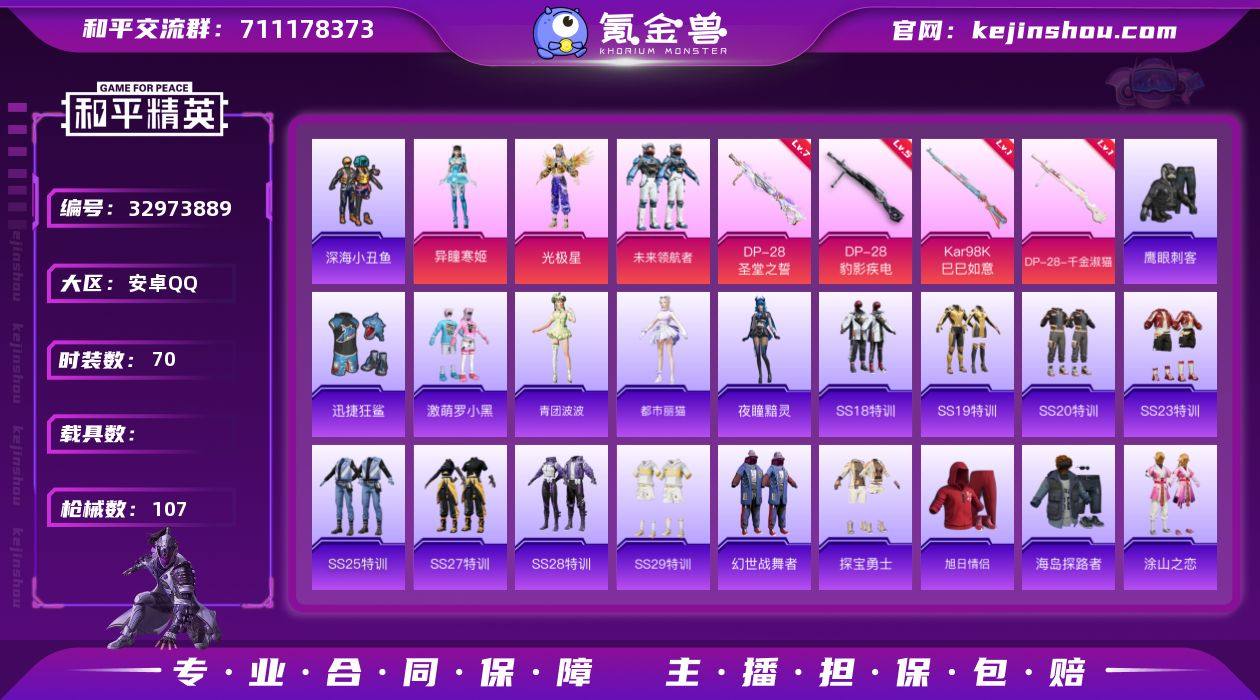 【FK6724】70套装/枪械5/装备109/战备64/王牌印记6/热力值30341/一级Kar98K-巳巳如意/五级Mk14-福马献瑞/七级DP-28-圣堂之誓/一级DP-28-千金淑猫/五级DP-28-豹影疾电/深海小丑鱼/光极星/未来领航者/异瞳寒姬/Kar98K-巳巳如意/Mk14-福马献瑞/DP-28圣堂之誓/DP-28-千金淑猫/DP-28-豹影疾电/洛神天依降落伞/炙焰牛王降落伞/未来歌姬降落伞/圣堂之誓降落伞/精灵梦叶罗丽降落伞/千金淑猫降落伞/套装-马上有钱/套装-迅捷龙虾/青团波波/都市丽猫/夜瞳黯灵/AKM-彩虹符号/AKM-破晓战魂/AKM-缤纷海域/AKM-龙的传人/M16A4-幻世战舞者/M16A4-千金淑猫/SCAR-L-玉兔迎春/SCAR-L-红色方程式/SCAR-L-青丘仙客/SCAR-L-黄金龙骨/M416-动感兔斯基/M416-圣诞惊喜/M416-红色方程式/M416-绯红前夜/QBZ-未来歌姬/QBZ-洛神天依/M762-绯红前夜/Mk47-洛神天依/G36C-暗夜玫瑰/G36C-青丘仙客/G36C-星穹咏叹调/AC-VAL-天降萌叽/蜜獾-天降萌叽/蜜獾-娇憨猪猪/UZI-娇憨猪猪/UZI-影袭/UZI-红色方程式/UMP45-蓝色火焰/UMP45-诡娃娃/Vector-暗夜玫瑰/汤姆逊-天降萌叽/汤姆逊-炫彩节奏/汤姆逊-耀粉歌者/汤姆逊-像素花束/AWM-圣堂之誓/SKS-未来歌姬/SKS-炫彩节奏/SKS-青丘仙客/SLR-娇憨猪猪/M417-惊鸿侠骨/MK20-H-...
