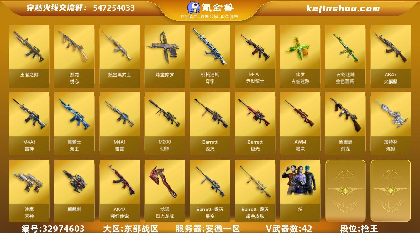 【ky6686】安徽一区-45V-3王者武器数-2炫金武器数 【热门武器】:M200-幻神,金色蔷薇-古蛇迷踪,修罗-古蛇迷踪,死亡之眼,汤姆逊-烈龙,加特林-炼狱,降世魔童 【王者炫金武器】:王者之戮,烈龙-悦心,炫金武士,炫金修罗 【音效卡】:M4A1-黑龙音效卡 【皮肤】:雷神-源计划2.0专属 皮肤,雷神-诺拉 皮肤,毁灭耀金皮肤,毁灭-星空,毁灭-英雄计划 皮肤,极光-能量核心 【角色】:炫,蛇隐宗,斗烈龙骑,暗夜-X,风暴女,嘉年华灵狐,龙儿-小淘气,潘多拉-甜心教官,青霞仙子,蛇姬,新娜塔莎,潘多拉-N 【人偶武器】:AWM-灵狐-15周年嘉年华,迷你波特博士,深渊终结者手雷,降世魔童 【暴走生化】:死亡之眼,超级对讲机 【挑战大师】:火狱乱世-超越Max 【英雄级武器】:AK47-火麒麟,M4A1-雷神,M4A1-雷霆,金色蔷薇-古蛇迷踪,AK-47-猩红传说,黑骑士-海王,机械迷城-穹宇,Barrett-毁灭*3,Barrett-极光,AWM-裁决,M200-幻神,加特林-炼狱,汤姆逊-烈龙,烈龙-悦心-觉醒版,沙鹰-天神,COP-雷霆*2,修罗-古蛇迷踪,麒麟刺*2,尼泊尔-雷霆,屠龙-斗烈龙驹,龙啸-烈火龙威,高爆手雷-雷霆*6,高爆手雷-古蛇迷踪,闪光弹-雷霆*6,烟雾弹-雷霆*6,烟雾弹-古蛇迷踪,M4A...