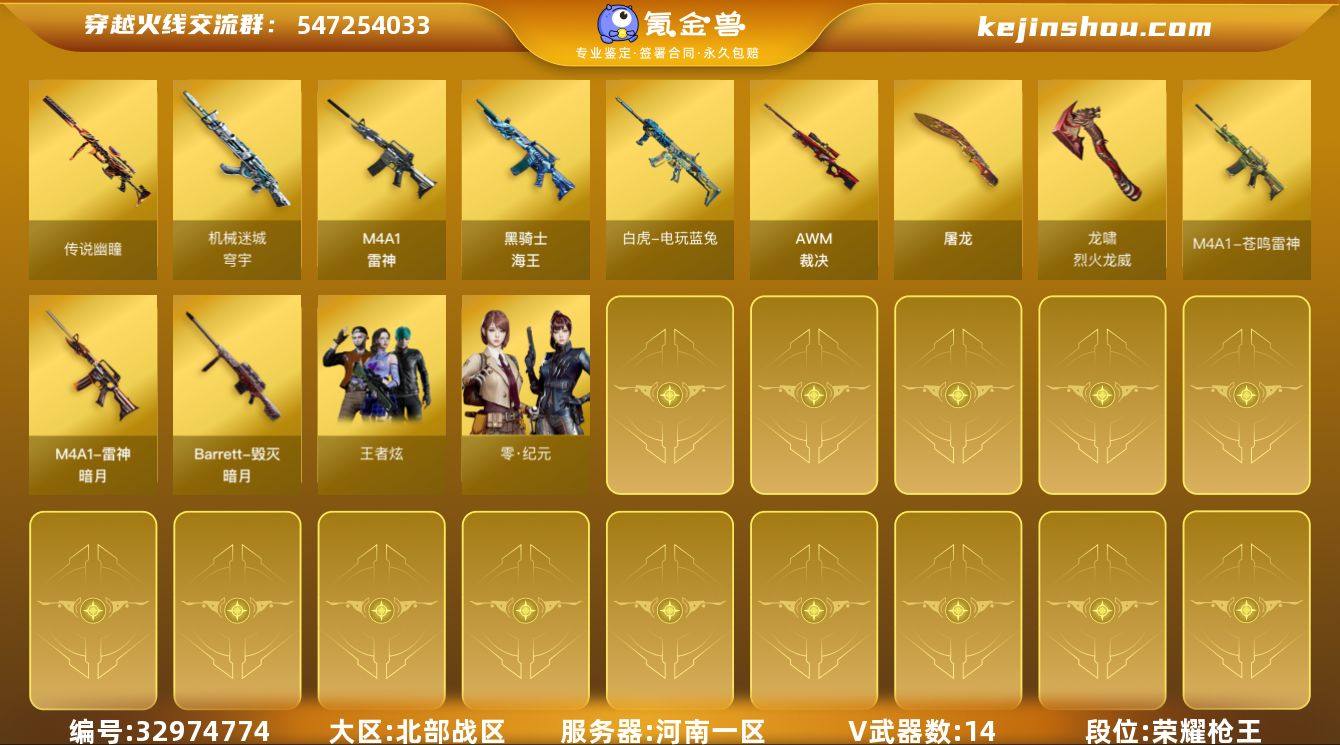 【ky6702】河南一区-20V-1王者武器数-0炫金武器数 【传说武器】:传说幽瞳 【热门武器】:传说幽瞳,白虎-电玩蓝兔,黄金猫猫手套-白鲨 【音效卡】:屠龙-电竞之星-竞星跃动音效卡,HK417-朱雀-电竞之星-竞星跃动音效卡,枪娘语音包-阿敏 【皮肤】:裁决-运输船 皮肤,雷神-暗月,雷神-神秘按键 皮肤,毁灭-暗月 【角色】:荆棘,零·纪元,太空指挥官,王者炫,修道士,幻面灵狐,斗烈龙骑,电竞少女,风暴女,兰-海滩派对,兰妹妹,0号玩家,零-水下丽影,龙儿,潘多拉-甜心教官,蛇姬,兔囡囡,维纳斯,雪莉杨-摸金校尉,团团 【人偶武器】:迷你钢铁终结者,生化手雷-机甲核心*2,迷你艾比 【暴走生化】:双面神,超级对讲机 【挑战大师】:AK47-冰龙粉碎者,试炼破坏者III 【英雄级武器】:M4A1-雷神,黑骑士-海王,白虎-电玩蓝兔,HK417-朱雀-电竞之星,机械迷城-穹宇,天罚-斗烈龙驹,AWM-裁决,屠龙,屠龙-电竞之星,屠龙-斗烈龙驹,龙啸-烈火龙威,烟雾弹-雷霆王者-觉醒版,M4A1-苍鸣雷神,AK47-竞魂无影 【其他武器】:源·雷神,魂·M4A1-雷神-化蛇,魂·雷神-诺拉,魂·雷神-神秘按键,魂·雷神-新春神龙,源·黑骑士,魂·黑骑士-破浪10年,御·黑骑士·哪吒闹海,魂·黑武...