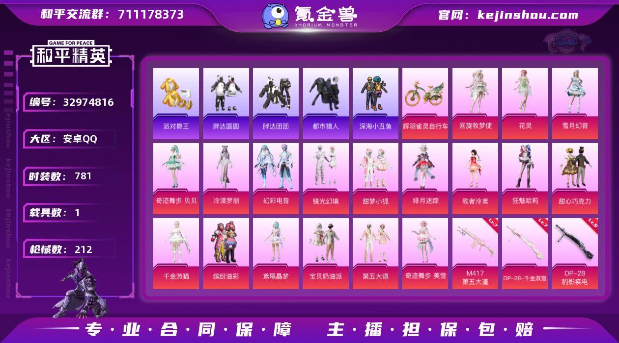 是个女号,号上有小狐,番茄,第五大道,巧克力头,猪脸,深海小丑鱼头,都市猎人,小金鞋,还有其他很多角色粉装,名字也算是比较好的,主页晋级赛标志是521,兵团也是单字兵团