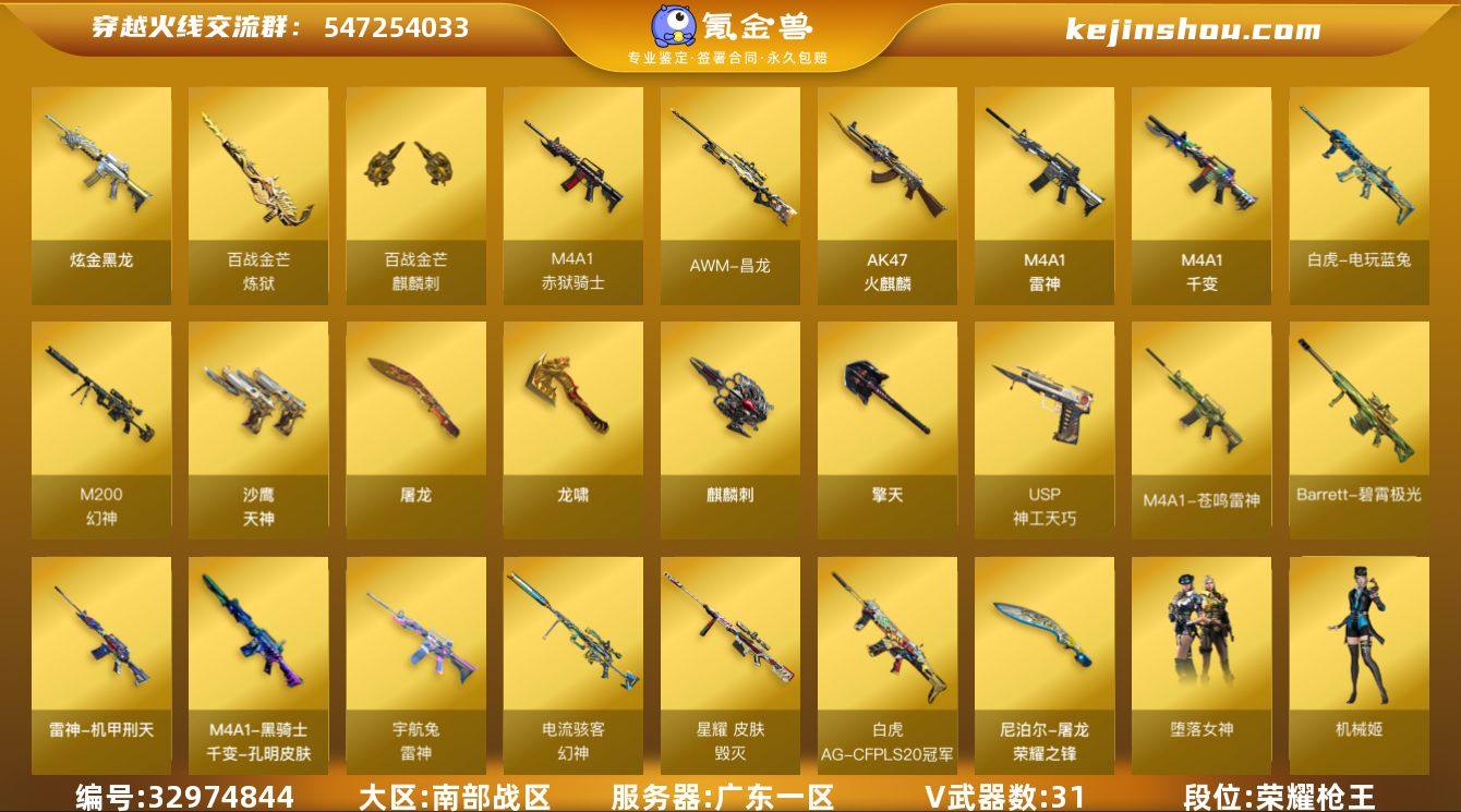 【ky6642】广东一区-37V-2王者武器数-1炫金武器数 【热门武器】:M200-幻神,白虎-电玩蓝兔,COP-白鲨 【王者炫金武器】:王者星魄,炫金黑龙 【音效卡】:屠龙-电竞之星-竞星跃动音效卡,Scar Light-白虎音效卡,HK417-朱雀-电竞之星-竞星跃动音效卡,M14EBR-玄武音效卡,M4A1-苍鸣雷神音效卡,M4A1-赤狱骑士-怀旧音效卡,炼狱-百战金芒-庆典舞曲音效卡,AWM-昌龙-怀旧音效卡 【皮肤】:幻神-电流骇客 皮肤,白虎-AG-CFPLS20冠军,金色蔷薇-电竞之星 皮肤,雷神-机甲刑天皮肤,雷神-宇航兔皮肤,M4A1-再燃火线,毁灭-星耀 皮肤,M4A1-千变-孔明皮肤,黑骑士-破界 皮肤,HK417-朱雀-紫霄 皮肤,修罗-百战金芒 皮肤,屠龙-荣耀之锋,轻型军用手斧-再燃火线 【角色】:机械姬,零·纪元,战地猎狐,堕落女神,乔伊教练,修道士,云海玲珑,葵-阿尔法武装,幻面灵狐,炽天使,风暴女,虎妞,嘉年华灵狐,娟娟,娜塔莉娅,蛇姬,兔囡囡,新娜塔莎,智影,团团 【人偶武器】:COP-白鲨,迷你深渊冰龙,迷你牛牛,生化手雷-机甲核心,深渊终结者手雷,迷你超能女侍 【暴走生化】:超级对讲机 【英雄级武器】:M4A1-千变,AK47-火麒麟,M4A1-雷神,QBZ03-独角-V,白虎-电玩蓝兔,HK417...