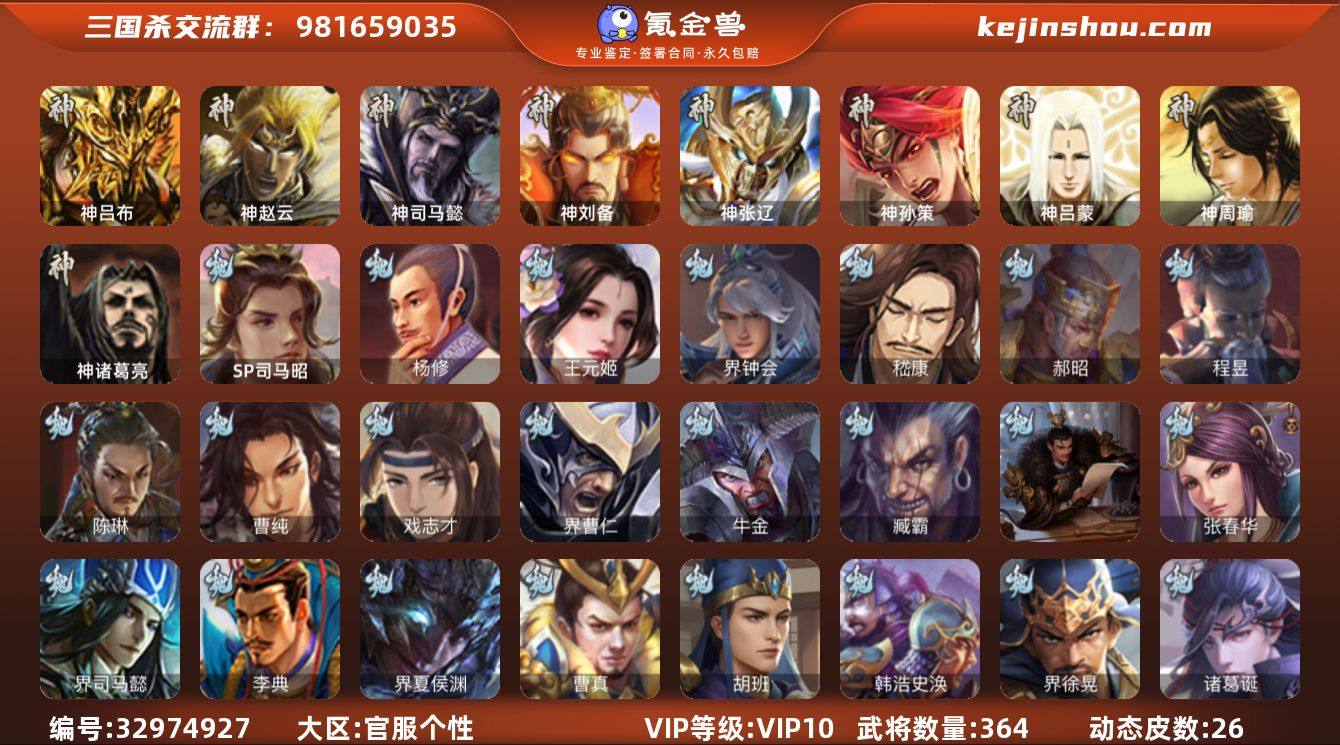 神吕布,神赵云,神司马懿,神刘备,神张辽,神孙策,神诸葛亮,SP司马昭,杨修,王元姬,界钟会,嵇康,郝昭,陈琳,曹纯,戏志才,程昱,马云騄,谋马超,赵襄,张星彩,沙摩柯,谯周,界黄忠,花鬘,董允,周处,界徐盛,左慈,星甘宁,麹义,祢衡,沮授,界李儒,卑弥呼,谋张角,许攸,兀突骨,司马昭,神吕蒙,神周瑜,SP关羽,SP曹仁,SP蔡文姬,乐进,曹昂,诸葛诞,朱灵,文聘,SP姜维,张春华,钟会,曹冲,郭淮,满宠,界王异,界曹操,界司马懿,界夏侯惇,界张辽,界许褚,界郭嘉,李典,曹真,韩浩史涣,陈群,曹叡,曹休,钟繇,司马朗,王基,李通,郭皇后,辛宪英,界甄姬,吕虔,鲁芝,蒯越蒯良,界典韦,界荀彧,界徐晃,杜畿,界曹丕,界邓艾,张恭,界曹植,界满宠,界郭淮,卞夫人,华歆,崔琰,阮慧,牵招,胡班,司马孚,牛金,界夏侯渊,界曹仁,臧霸,唐咨,势陈到,SP孙尚香,关银屏,夏侯霸,马良,关兴张苞,廖化,界马岱,关平,简雍,刘封,界法正,界关兴张苞,界刘备,界关羽,界张飞,界赵云,界马超,SP徐庶,吴懿,周仓,张松,刘谌,夏侯氏,糜竺,马忠,孙乾,李严,黄皓,吴苋,秦宓...