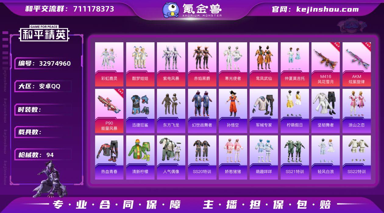 材号-7粉装-4特效枪-:粉装-彩虹鹿灵,粉装-酣梦娃娃,粉装-赤焰黑爵,粉装-紫电风暴,粉装-鸾凤武仙,粉装-寒光使者,粉装-仲夏莫吉托】地铁40点天赋 安卓 手Q-7粉装-4特效枪-0载具-2粉色飞行器-27662热力值-4王牌印记-60套装-94枪皮 【热门品类】:套装-龟仙人 【粉色套装】:粉装-彩虹鹿灵,粉装-酣梦娃娃,粉装-赤焰黑爵,粉装-紫电风暴,粉装-鸾凤武仙,粉装-寒光使者,粉装-仲夏莫吉托 【粉色枪皮等级】:AKM-炫紫旋律(四级),M416-风花雪月(五级),UMP45-萌骑冒险(一级),P90-能量风暴(四级) 【粉色枪皮】:AKM-炫紫旋律,M416-风花雪月,UMP45-萌骑冒险,P90-能量风暴 【粉色飞行器】:千面幻镜飞行器,黄族统领飞行器 【粉色降落伞】:甜蜜誓约降落伞,风花雪月降落伞,橘柚倾心降落伞,冷魅冰骑降落伞,彩虹甜喵降落伞,音爆索尼克降落伞,南国舞曲降落伞,未来歌姬降落伞,鸢尾珑雾降落伞 【稀有套装】:套装-龟仙人,角色-幸运青,套装-迅捷龙虾 【稀有枪皮】:AKM-彩虹符号,AKM-破晓战魂,AKM-龙的传人,M16A4-幻世战舞者,M16A4-蓝色火焰,SCAR-L-玉兔迎春,SCAR-L-甜蜜誓约,M416-糯团青竹,M416-蓝色火焰,GROZA-影袭,GROZA-懵萌河马,AUG-天降萌叽,AUG-怪...