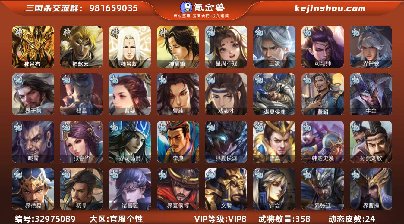 官阶:大将军;VIP等级:VIP8;史诗武将数量:34;动态皮肤数量:24;武将总数:358;史诗宝珠数量:0;将魂数量:1835;神将:2;魏国史诗武将:12;蜀国史诗武将:9;吴国史诗武将:5;群史诗武将:9