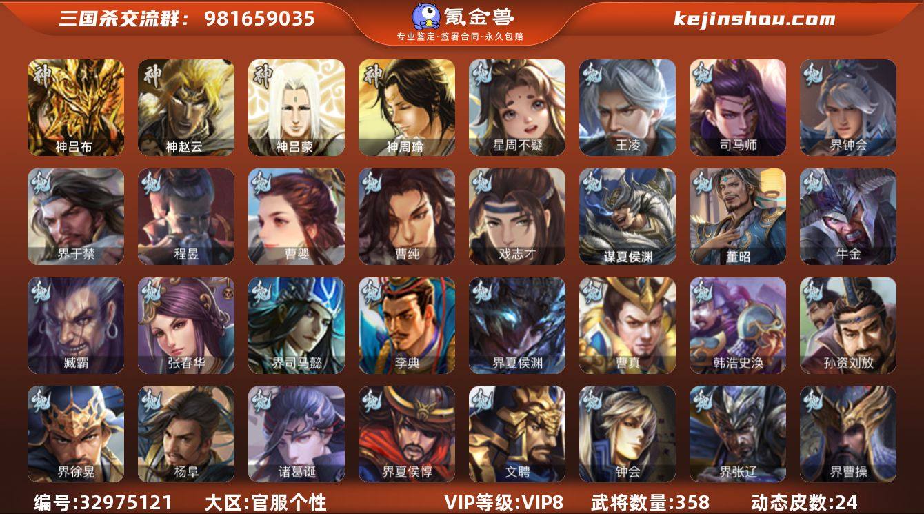 官阶:大将军;VIP等级:VIP8;史诗武将数量:34;动态皮肤数量:24;武将总数:358;史诗宝珠数量:0;将魂数量:1835;神将:2;魏国史诗武将:12;蜀国史诗武将:9;吴国史诗武将:5;群史诗武将:9