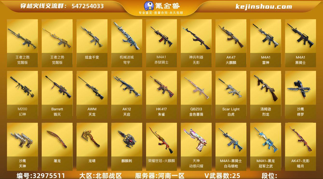 北部战区(河南一区)ys【精品爆破号】25v【M200-幻神,QBZ03-金色蔷薇,ScarLight-白虎,HK417-朱雀,荣耀世冠-火麒麟,Colt1911-大黄蜂,金刚伞】2王者【王者之戮,王者之势】1炫金【炫金千变】3角色【零,王者涂鸦,乔伊教练】1音效【Barrett-毁灭音效卡】17皮【黑龙-冠军之武,毁灭-战神张飞,毁灭-星空,天龙-CF STAR,雷神-白鲨-CFPLS14冠军,火麒麟-AG战队,龙啸-冠军之啸】 截图展示段位不代表实际段位 如赛季更新等不可抗拒因素发生变化、时限道具不保证所剩时间