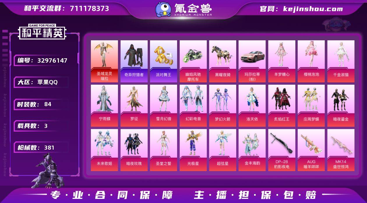 3载具-214套装-381枪皮-苹果手Q/质量套装号/5级红装-星梦奇缘-小熊背包/地铁满天赋//-19王牌印记-1红装-19粉装-26特效枪-3载具-热力值-214套装-381枪皮-3卓越印记 【1红装】圣域龙灵-瑞拉/5级 【19粉装】套装-雪月幻音,套装-幻彩电音,套装-暗夜鎏金,套装-庄周梦蝶,角色-圣堂之誓,角色-宁雨蝶,角色-超弦星,角色-洛天依,套装-炙焰红王,角色-绝对恒星,套装-金丰海韵,角色-光极星,角色-羊梦糖心,套装-未来歌姬,角色-千金淑猫,套装-梦幻火箭,角色-樱桃泡泡,套装-暗夜玫瑰,角色-罗征 【26特效枪】Mk14-福马献瑞/5级,UMP45-雪国精灵/7级,MG3-洛神天依/7级,AKM-幽焰骑士/1级,AKS-74U-信仰神谕/5级,AKM-暮色玫影/3级,Kar98K-巳巳如意/5级,SCAR-L-童趣迷兔/7级,AUG-暖羊咩咩/5级,M249-绝对恒星/5级,ACE32-萌骑漫游/1级,M416-五爪金龙/2级,SCAR-L-锦绣绵绵/5级,P90-金丰海韵/6级,Mk14-盛世惊鸿/6级,AKM-梦之光华/7级,AUG-星梦奇缘/6级,M200-梦海之灵/3级,DP-28-豹影疾电/5级,AMR-智耀战神/5级,MG3-酷泡奶龙/2级,Vector-最终圣卫者/3级,M416-墨龙九天/6级,AUG-许七安/1级,SCAR-L-青春物语/1级,GROZA-镜光银凌/5级 【7稀有紫装】Mark.06,派对舞王,奇异狩猎者,暗影哥特,浪漫天命,龟仙人,萌熊...