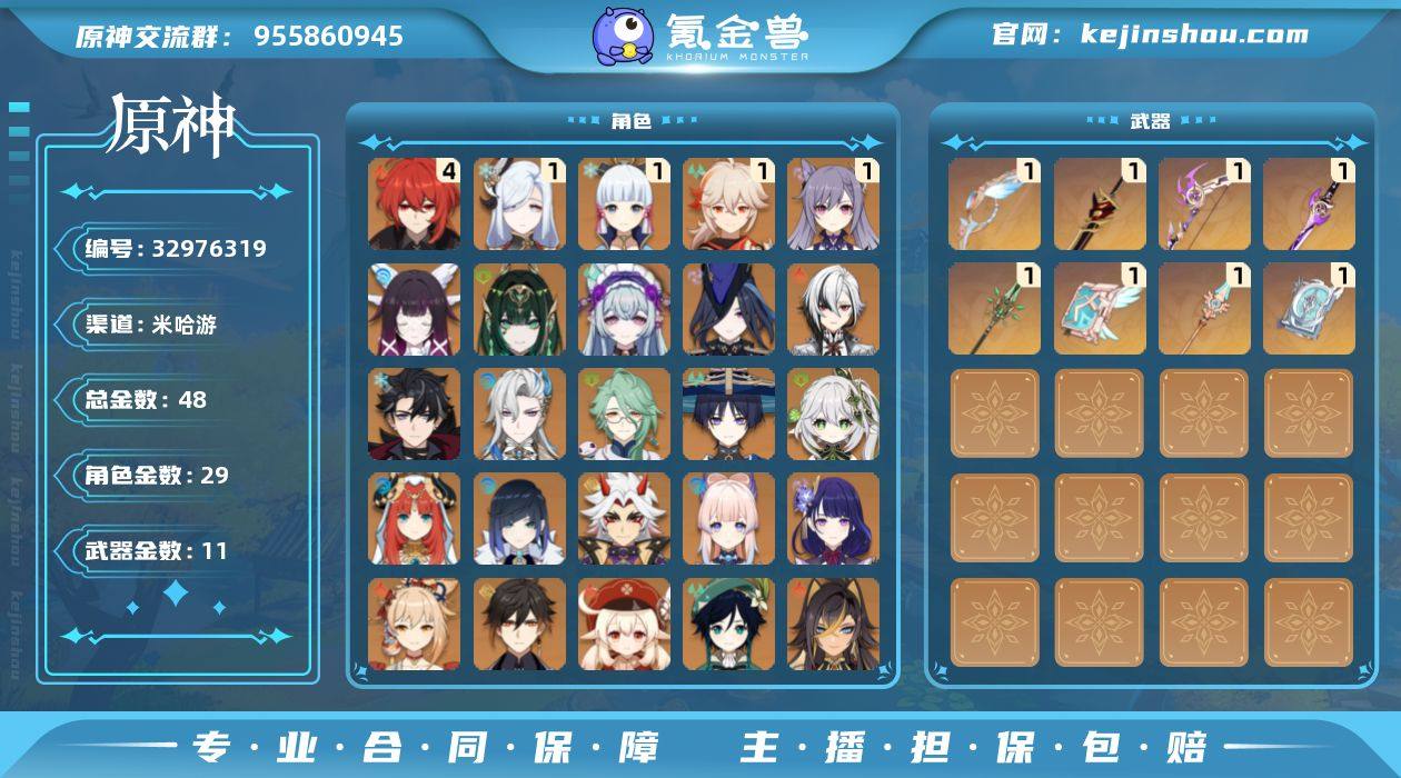 邮箱: 不送邮/死邮 总黄数: 48 冒险等级: 58 4命金色角色: 四命迪卢克 1命金色角色: 一命枫原万叶,一命神里绫华,一命刻晴,一命申鹤 0命金色角色: 温迪,宵宫,可莉,七七,钟离,莫娜,琴,雷电将军,珊瑚宫心海,荒泷一斗,夜兰,提纳里,妮露,纳西妲,流浪者,迪希雅,白术,那维莱特,莱欧斯利,阿蕾奇诺,克洛琳德,梦见月瑞希,奈芙尔,哥伦比娅 拥有武器: 雾切之回光,飞雷之弦振,四风原典,天空之卷,和璞鸢,天空之脊,赤角石溃杵,白雨心弦 1精武器: 雾切之回光,飞雷之弦振,四风原典,天空之卷,和璞鸢,天空之脊,赤角石溃杵,白雨心弦