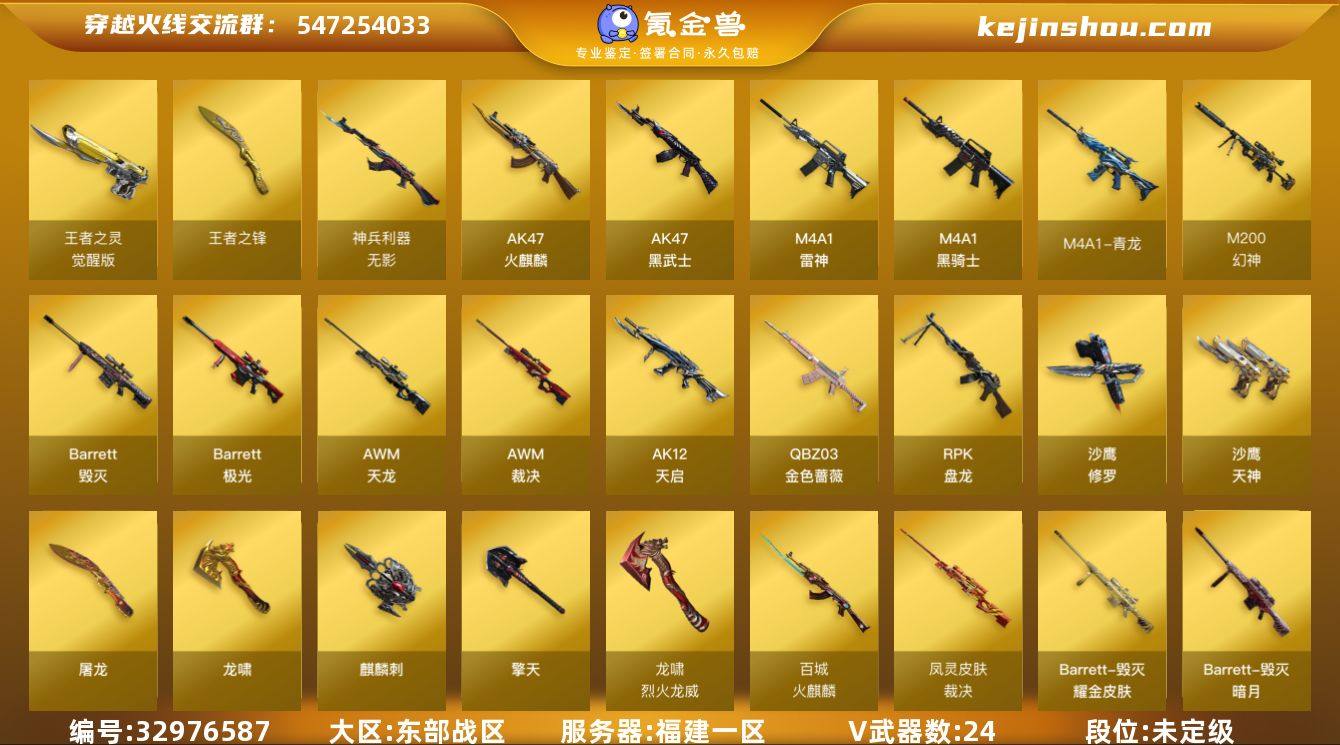 福建一区-27V-3王者武器数-0炫金武器数 【热门武器】:QBZ03-金色蔷薇,M4A1-青龙,M200-幻神,M4A1-黑骑士,RPK-盘龙,裁决-雪莉杨,沙鹰-修罗*2 【王者炫金武器】:王者之锋 【音效卡】:Barrett-毁灭音效卡 【皮肤】:金色蔷薇-纸灯龙皮肤,AWM-裁决-凤灵皮肤,雷神-维纳斯皮肤,M4A1-雷神-新春神龙皮肤,火麒麟-百城,毁灭-暗月,毁灭耀金皮肤,黑骑士-破浪10年皮肤,炼狱-月 皮肤,修罗-15周年嘉年华 皮肤,麒麟刺-萌杀皮肤 【角色】:隼,王者涂鸦,初恋灵狐,电竞少女,猎狐者-追月,灵狐者-七夕宝贝,灵狐者-职业经理,曼陀罗-礼服,潘多拉-甜心教官,青霞仙子,赛斯-X,兔囡囡,维纳斯,新娜塔莎,影武者-X,雅典娜 【人偶武器】:裁决-雪莉杨,迷你牛魔王 【暴走生化】:超级对讲机 【挑战大师】:冰龙粉碎者-白马银枪,神圣爆裂者-末日III 【英雄级武器】:AK47-火麒麟,M4A1-雷神,M4A1-黑骑士,AK47-黑武士*2,AK12-天启,M4A1-青龙,无影-神兵利器,QBZ03-金色蔷薇,AWM-天龙,Barrett-毁灭,Barrett-极光,AWM-裁决,M200-幻神,Barrett-金色蔷薇,RPK-盘龙,炼狱-悦蓝-觉醒版,沙鹰-修罗*2,沙鹰-天神,王者之灵-觉醒版,屠龙,龙啸,擎天,麒麟刺,龙啸-烈火...