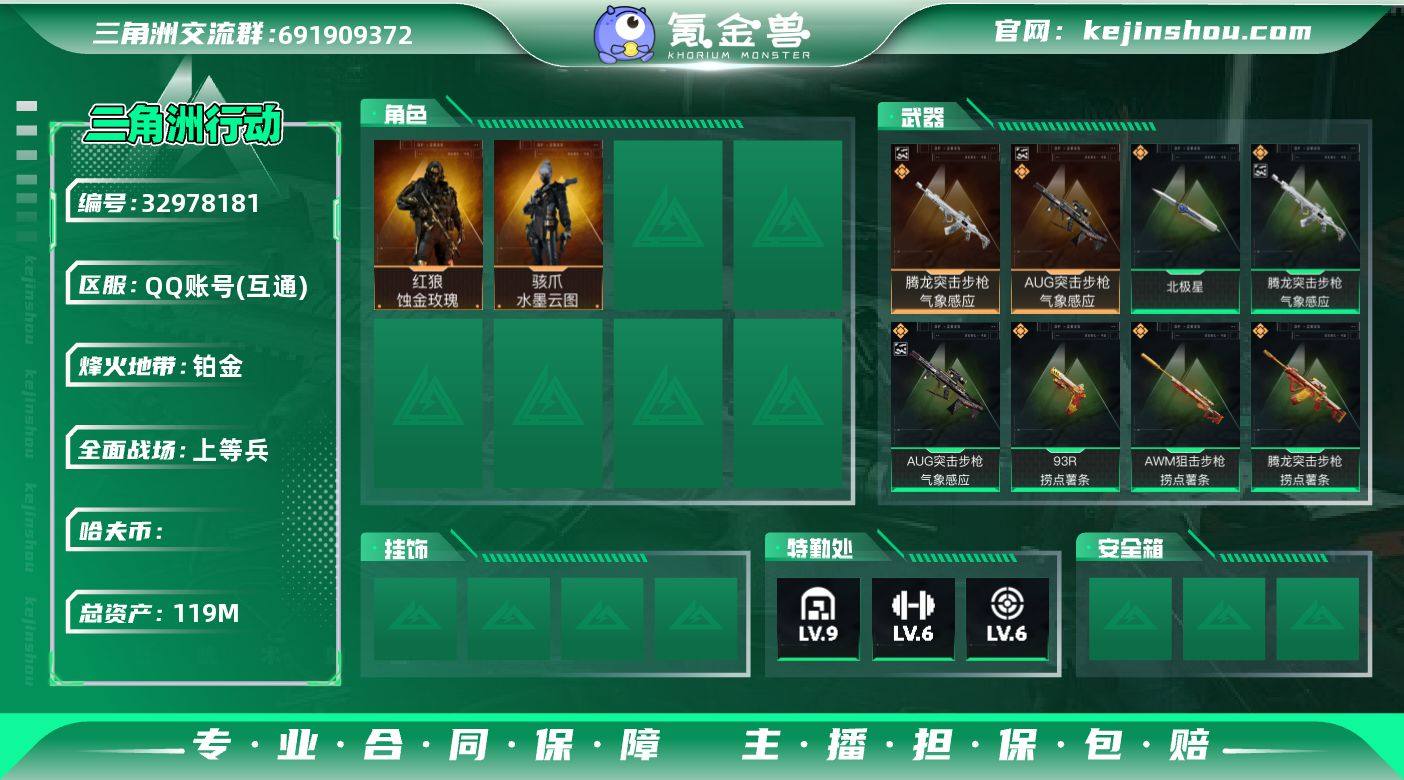 总资产:119.3M 3干员外观 1近战传说 16传说枪械 哈夫币:460.671K 不可修改实名 【烽火地带段位】钻石 【全面战场段位】上等兵 【干员外观】红狼-蚀金玫瑰,骇爪-水墨云图,露娜-金牌射手(S7) 【传说武器皮肤】近战-北极星,K416突击步枪-命运(典藏),AUG突击步枪-气象感应(典藏),腾龙突击步枪-气象感应(典藏),腾龙突击步枪-捞点薯条,M4A1突击步枪-阿米娅,CAR-15突击步枪-阿米娅,AWM狙击步枪-捞点薯条,93R-捞点薯条,SG552突击步枪-运动员,K437突击步枪-几何解构,ASh-12战斗步枪-鹅鸭杀,QCQ171冲锋枪-鹅鸭杀,QJB201轻机枪-鹅鸭杀,KC17突击步枪-电锯惊魂,M4A1突击步枪-蚀金玫瑰