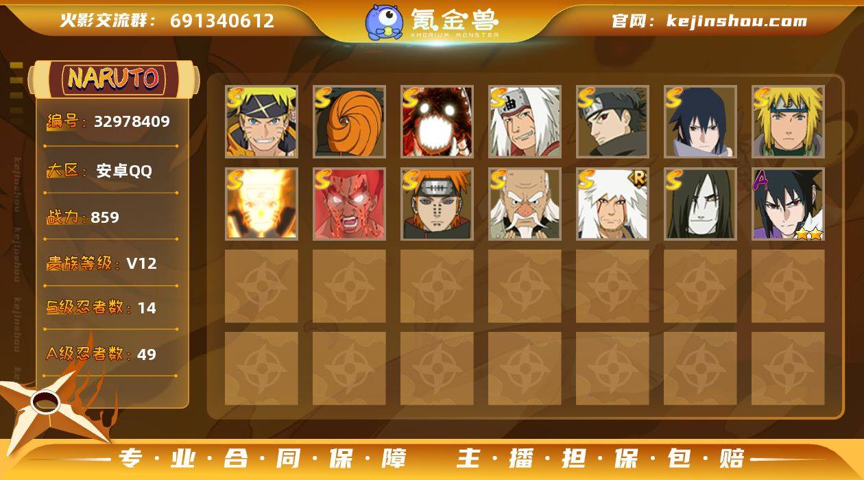 实名: 可修改 贵族等级: V12 S忍数: 14 A忍数: 49 战力值(万): 859 S级忍者: 佩恩「天道」,大蛇丸,波风水门,迈特凯「死门」,大野木 「忍界大战」,自来也 「舞之豪杰」,漩涡鸣人 「九喇嘛连结」,宇智波佐助「永恒万花筒」,宇智波止水「须佐能乎」,自来也 「传说中的三忍」,漩涡鸣人 「暴怒·第六尾」,宇智波斑「五影会谈」,漩涡鸣人·宇智波佐助 亮点: 【优质装备】:迈特凯「死门」,漩涡鸣人 「九喇嘛连结」,宇智波佐助「永恒万花筒」,宇智波止水「须佐能乎」,自来也 「传说中的三忍」,漩涡鸣人 「暴怒·第六尾」