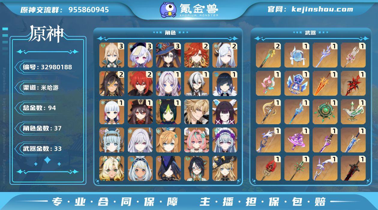 邮箱: 不送邮/死邮 总黄数: 94 冒险等级: 60 3命金色角色: 三命七七,三命莫娜,三命琴 2命金色角色: 二命迪卢克,二命申鹤,二命迪希雅,二命玛薇卡 1命金色角色: 一命神里绫华,一命胡桃,一命夜兰,一命提纳里,一命阿蕾奇诺,一命茜特菈莉 0命金色角色: 枫原万叶,优菈,宵宫,刻晴,钟离,魈,雷电将军,珊瑚宫心海,八重神子,纳西妲,白术,芙宁娜,娜维娅,闲云,克洛琳德,玛拉妮,希诺宁,梦见月瑞希,瓦雷莎,爱可菲,丝柯克,伊涅芙,哥伦比娅,法尔伽 拥有武器: 狼的末路,天空之翼,雾切之回光,四风原典,和璞鸢,阿莫斯之弓,天空之傲,风鹰剑,护摩之杖,松籁响起之时,神乐之真意,若水,千夜浮梦,碧落之珑,静水流涌之辉,裁断,赤月之形,岩峰巡歌,焚曜千阳,祭星者之望,溢彩心念,香韵奏者,苍耀,帷间夜曲 2精武器: 岩峰巡歌 1精武器: 狼的末路,天空之翼,雾切之回光,四风原典,和璞鸢,阿莫斯之弓,天空之傲,风鹰剑,护摩之杖,松籁响起之时,神乐之真意,若水,千夜浮梦,碧落之珑,静水流涌之辉,裁断,赤月之形,焚曜千阳,祭星者之望,溢彩心念,香韵奏者,苍耀,帷间夜曲 亮点: 【sy83】94黄37人2命火神1命奶奶仆人 少女丝柯克希诺宁瓦雷莎爱可菲带专武等1966360级/94黄/女主/37个五星角色/33个五星武器0命克洛琳德,1命阿蕾...