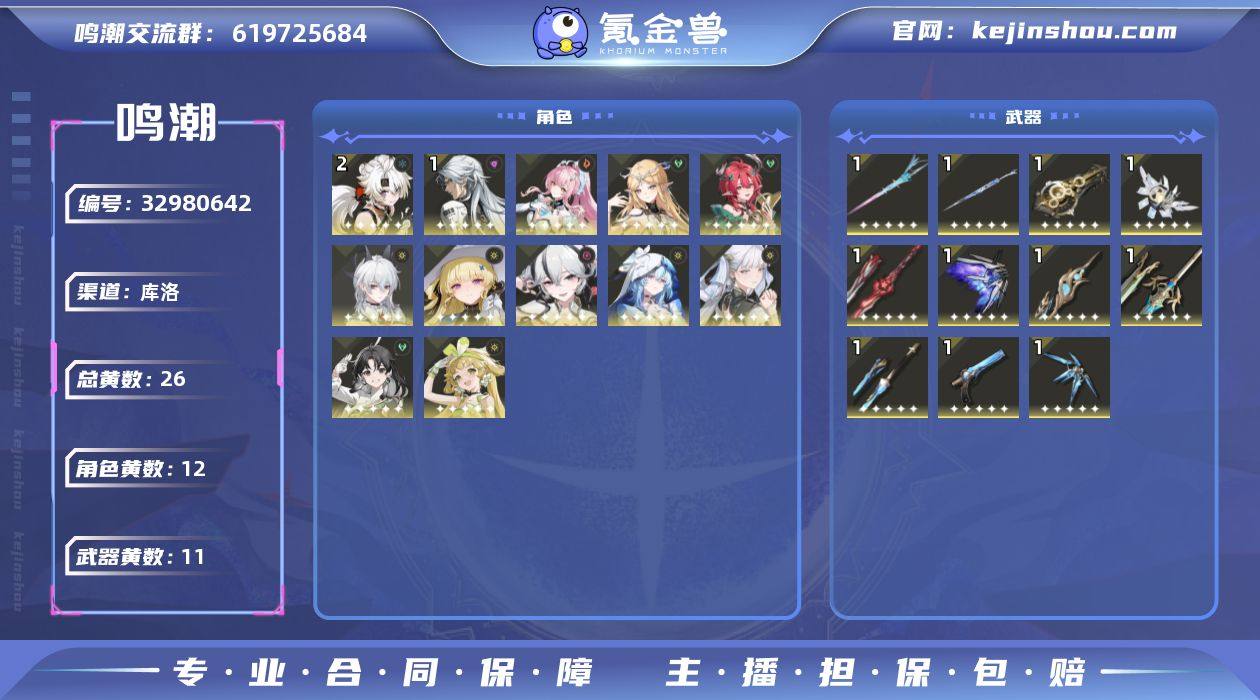 男/女主: 男主 总黄数: 26 联觉等级: 80 拥有五星共鸣者: 鉴心,卡卡罗,维里奈,凌阳,今汐,守岸人,椿,菲比,赞妮,夏空,卡提希娅,爱弥斯 2鸣五星共鸣者: 2鸣凌阳 1鸣五星共鸣者: 1鸣卡卡罗 0鸣五星共鸣者: 0鸣鉴心,0鸣维里奈,0鸣今汐,0鸣守岸人,0鸣椿,0鸣菲比,0鸣赞妮,0鸣夏空,0鸣卡提希娅,0鸣爱弥斯 拥有五星武器: 千古洑流,停驻之烟,漪澜浮录,时和岁稔,星序协响,裁春,和光回唱,血誓盟约,焰光裁定,不屈命定之冠,永远的启明星 1鸣五星武器: 1鸣千古洑流,1鸣停驻之烟,1鸣漪澜浮录,1鸣时和岁稔,1鸣星序协响,1鸣裁春,1鸣和光回唱,1鸣血誓盟约,1鸣焰光裁定,1鸣不屈命定之冠,1鸣永远的启明星 亮点: 【MC173】80级/26黄/男主/12个五星角色/11个五星武器未绑定,爱弥斯,卡提希娅,赞妮,夏空,菲比,椿,守岸人,今汐,维里奈,鉴心,卡卡罗,凌阳,永远的启明星,不屈命定之冠,焰光裁定,血誓盟约,和光回唱,裁春,星序协响,时和岁稔,千古洑流,停驻之烟,漪澜浮录,2命凌阳,1命卡卡罗,0命爱弥斯,0命卡提希娅,0命赞妮,0命夏空,0命菲比,0命椿,0命守岸人,0命今汐,0命维里奈,0命鉴心,精1永远的启明星,精1不屈命定之冠,精1焰光裁定,精1血誓盟约,精1和光回唱,精1裁春,精1星序协响,精1时和岁稔,精1千古洑流,精1停...