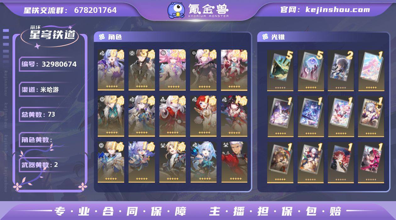 总黄数: 73 五星光锥数: 2 开拓等级: 70 开拓者性别: 女 6命金色角色: 6命知更鸟 3命金色角色: 3命瓦尔特 2命金色角色: 2命布洛妮娅,2命克拉拉,2命砂金,2命风堇,2命长夜月,2命昔涟 1命金色角色: 1命彦卿,1命白露,1命杰帕德,1命花火,1命缇宝 精5武器: 精5星海巡航,精5记忆永不落幕 精2武器: 精2但战斗还未结束 精1武器: 精1时节不居,精1如泥酣眠,精1以世界之名,精1银河铁道之夜,精1烦恼着,幸福着,精1记一位星神的陨落,精1镜中故我,精1夜色流光溢彩,精1愿虹光永驻天空,精1海洋为何而歌,精1致长夜的星光,精1爱如此刻永恒 亮点: 【xt166】等级:70/总黄数:73/女主/角色黄数:49昔涟,长夜月,刻律德菈,Archer,风堇,遐蝶,缇宝,星期日,知更鸟,砂金,花火,阮•梅,托帕&账账,符玄,希儿,白露,彦卿,克拉拉,杰帕德,布洛妮娅,瓦尔特,姬子,爱如此刻永恒,致长夜的星光,海洋为何而歌,愿虹光永驻天空,记忆永不落幕,夜色流光溢彩,镜中故我,烦恼着,幸福着,时节不居,但战斗还未结束,如泥酣眠,银河铁道之夜,以世界之名,星海巡航,记一位星神的陨落,满命知更鸟,3命瓦尔特,2命昔涟,2命长夜月,2命风堇,2命砂金,2命克拉拉,2命布洛妮娅,1命缇宝,1命花火,1命白露,1命彦卿,1命杰帕德,0命刻律德菈,0命Archer,...