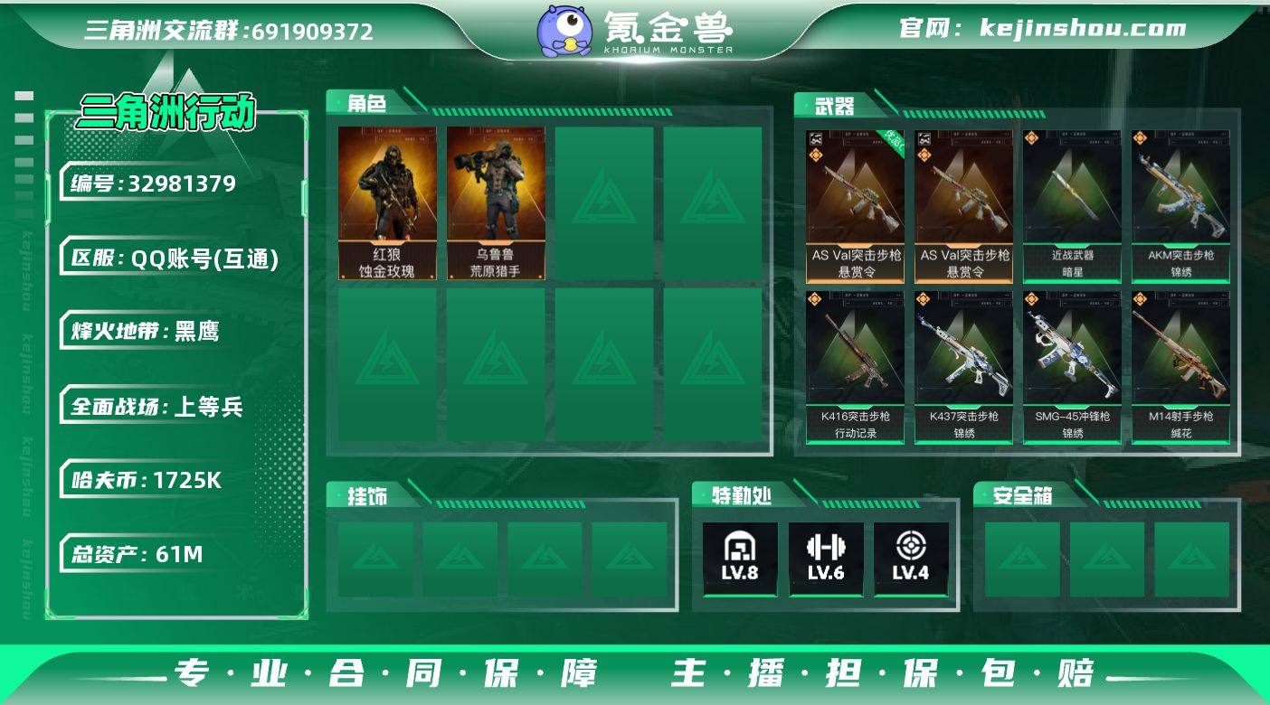 【SJZ4853】总资产(M):61M/哈夫币(K):1725K/哈夫币(K):1725K/传说枪皮数:16/全面战场等级:18_段位:上等兵/烽火地带等级:60_段位:黑鹰/红狼-蚀金玫瑰/乌鲁鲁-荒原猎手/近战-暗星/近战-黑鹰/AS Val突击步枪-悬赏令/优品C典藏武器外观-AS Val突击步枪-悬赏令/M4A1突击步枪-蚀金玫瑰/AKM突击步枪-锦绣/K416突击步枪-行动记录/AUG突击步枪-悠然茶歇/K437突击步枪-锦绣/MK47突击步枪-悠然茶歇/MK47突击步枪-暗星/UZI冲锋枪-悠然茶歇/SMG-45冲锋枪-锦绣/SR-3M紧凑突击步枪-暗星/QCQ171冲锋枪-不羁人生/M14射手步枪-蛮荒/M14射手步枪-缄花/SR-25射手步枪-缄花/.357左轮-缄花/K416突击步枪-腊梅/K437突击步枪-丛林谍踪/SR-3M紧凑突击步枪-开工大吉/勇士冲锋枪-丛林谍踪/MP7冲锋枪-六套之力/PKM通用机枪-阿萨拉特攻/M249轻机枪-丛林谍踪/M250通用机枪-囚徒/QJB201轻机枪-炽焰/VSS射手步枪-丛林谍踪/SG552突击步枪-马年新春/SG552突击步枪-贴花艺术/ AK-12突击步枪-马年新春/CAR-15突击步枪-来财/AS Val突击步枪-前沿科技/KC17突击步枪-来财/MP5冲锋枪-哈夫克卫队/Vector冲锋枪-先锋/SMG-45冲锋枪-行动开启/SR-3M紧凑突击步枪-马年新春/M1014霰弹枪-幻影结构/Mini-14射手步枪-荣...