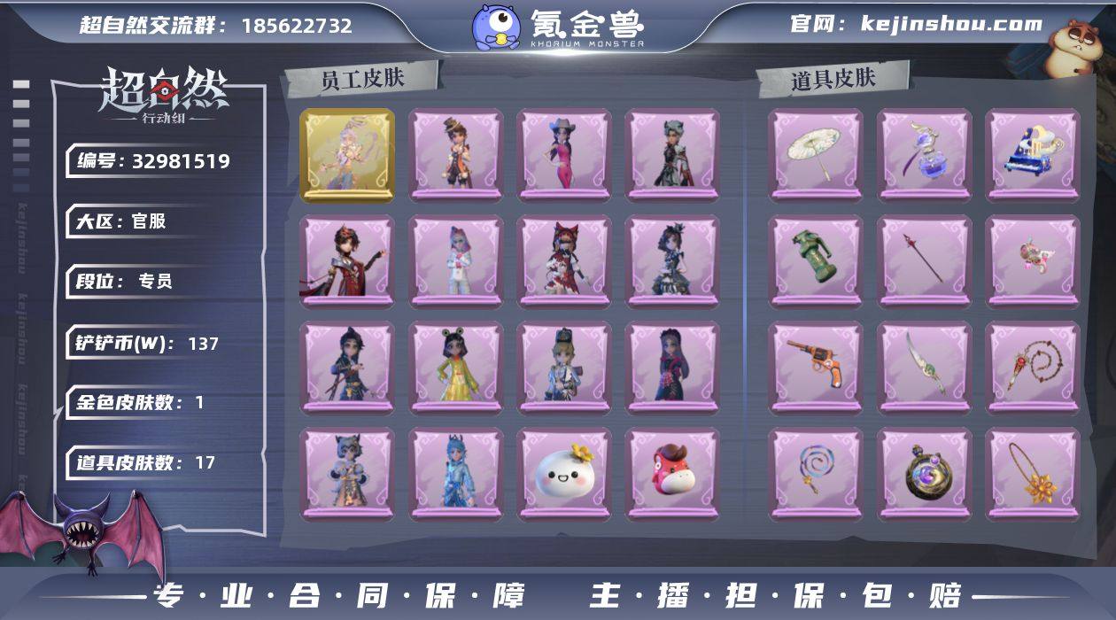 金皮1;紫皮13;道具皮17;皮肤:逍遥-莲华渡,阿念-庆宴绮愿,爱丽丝-耀眼的你,艾伦-绒绒对决,小黄-呱呱雨衣,莉莉-莓果陷阱,爱丽丝-丝缕哀歌,小黄-异色序曲,逍遥-绣春逍影,艾伦-水王子,小黄-霓裳踏雪,薇薇安-仙锋小姐,艾伦-黎明猎手,阿念-王子与骑士;道具:转轮手枪-新星时代,黄牛能量饮料-无人岸,短管猎枪-赞萌露比水枪,长鞭-缚誓之锁,电击枪-甜蜜泡泡枪,长枪-罪棘,长鞭-飞天绫,喷气背包-乘风溯雪,伞-郁金春信,闪光弹-金戈玄铜,音响-月光奏鸣曲,音响-鸣沙鼓,传送按钮-逆时审判,短管猎枪-星光的裁决,摸金符-花落精绝,急救包-蔷薇物语,刺刀-碧络琅环;美妆:美妆-听潮祝福;饰品:头饰-咬咬鲨头套,头饰-烛光纪念,头饰-卑微头套,头饰-蒜了八,头饰-面具马头套,头饰-雪墩墩头套,头饰-大葱明头套,头饰-芝麻糊汤圆,头饰-烈焰红唇头套,头饰-惊魂南瓜头套,头饰-马上有钱,头饰-炙热烧烤,头饰-腊肠扭扭,头饰-鳄霸天头套,头饰-嘻嘻头套,头饰-哈士奇头套,头饰-呆滞头套,头饰-火爆了头套,头饰-鱼头怪头套,头饰-驼半仙头套,头饰-樱桃奶油布丁,头饰-萨卡班甲鱼头套,头饰-饺饺者头套,头饰-滑稽头套,头饰-像素朋克墨镜,头饰-粽小宝头套,头饰-哞哞牛头套,头饰-后室幸存者头套,挂饰-糖果守卫,挂饰...