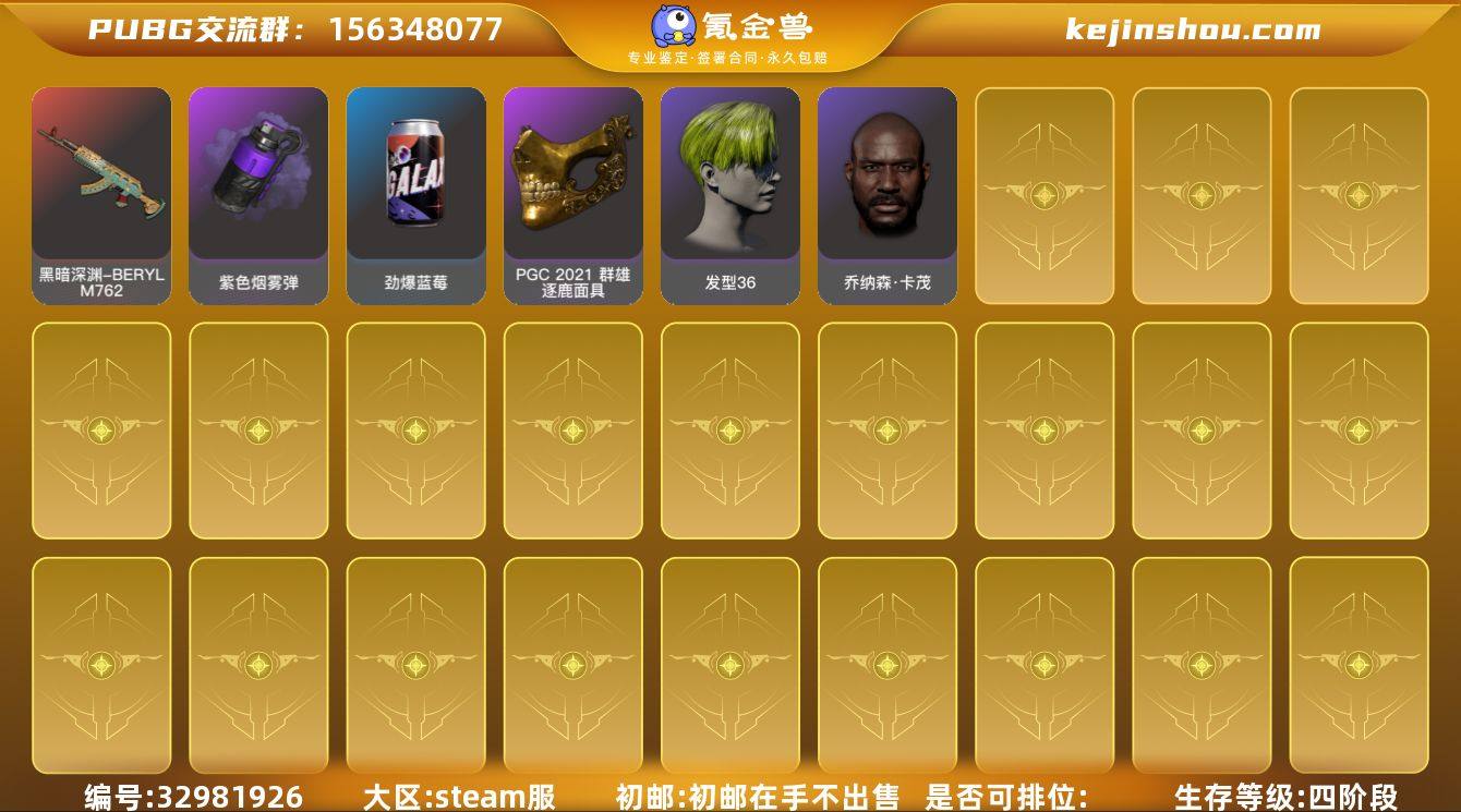 账号来源: 自营 初邮情况: 初邮在手不出售 热门装扮: 金面具,渔夫帽 拥有成长型武器: 孙悟空-M24