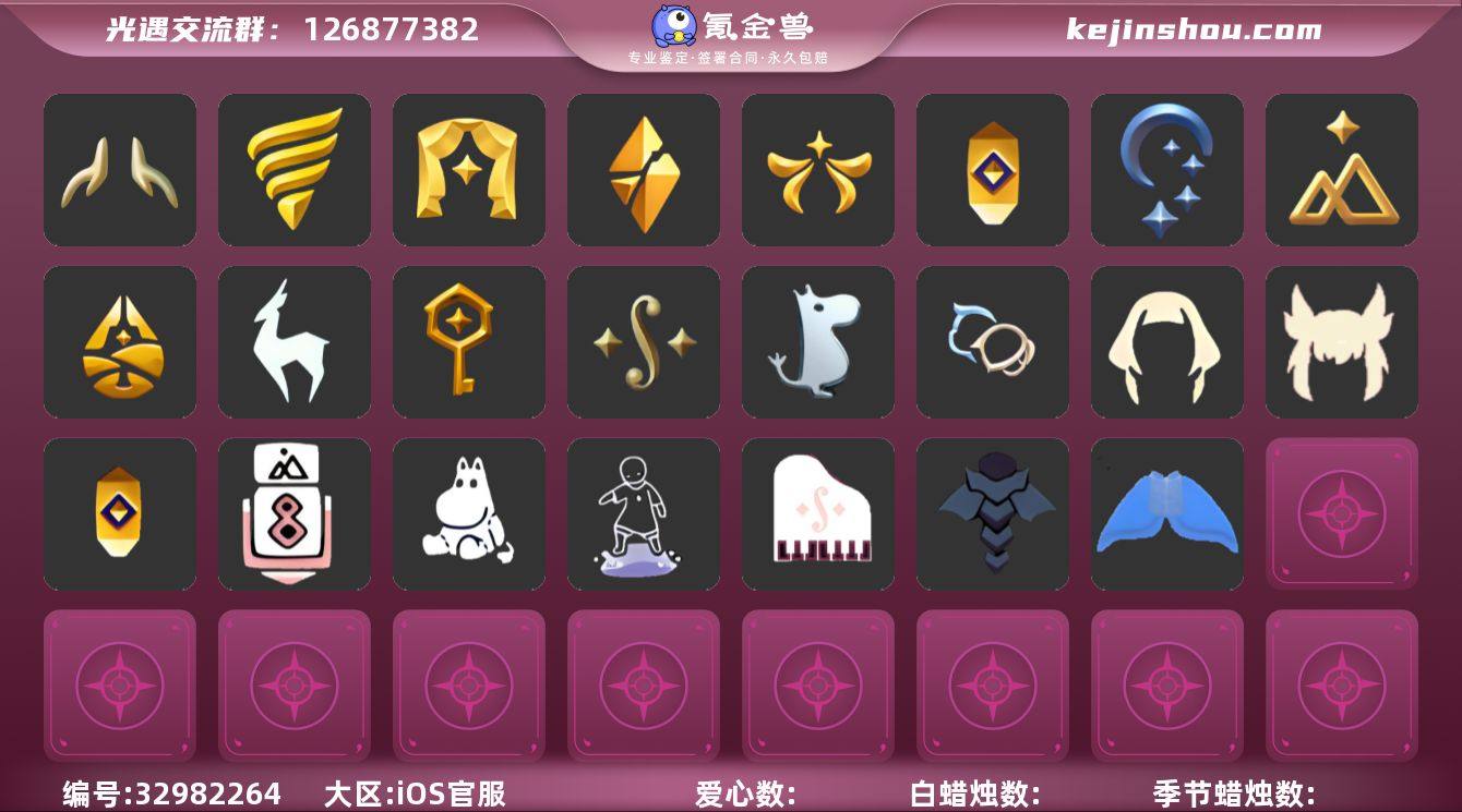 蜡烛130,爱心0,季蜡15,升华蜡烛745,光翼174,毕业季:追忆季,二重奏,筑巢季,破晓季,欧若拉,夜行季,归巢季,九色鹿,织光季,表演季,拾光季,双星季,潜海季,姆明季;毕业礼:季卡相机,姆明伞,鲲灯,三角钢琴,姆明抱枕,二重奏海报,筑巢手办,暗红斗篷,冥龙斗篷,双翼遥鲲斗,透明蝶翼斗篷,绒毛斗篷,五朔彩带斗篷,飘带斗篷,双排扣斗篷,暮星斗篷,暮星斗篷,白枭发型,留辫蘑菇头,五朔彩羽发型,飞天盘发,荧光长发,西部帽,蓝色星星光环,单边小辫,潜水面具,黄眉企鹅面具,棕熊面具,裂纹面具,青鸟面饰,肩带,高领舞服,柔缎花边连体裤,妮妮长裙,迁徙套装,迁徙季短靴,设计师长袍;礼包:欧若拉之声,新年红伞,飞鸟纸伞,秋千,花憩茶桌,小憩茶桌,船,皮皮猫,周年庆抱枕,必胜客披萨,创始人斗篷,欧若拉之翼,新春福娃,年年有鱼,海龟斗篷,蝙蝠斗篷,皮皮猫斗篷,白雪斗篷,绊爱斗篷,青衫落拓,远行发型,多彩绒帽,巫师帽,蝴蝶与花发饰,橘子发饰,鲤跃龙门,暖冬绒绒,奥利奥发饰,雪花头饰,雪人头饰,贝壳,玉兔头饰,心相印发饰,绿绒绒卷耳发饰,四叶草,粽子发饰,小黄鸭发饰,星月头冠,彩虹耳钉,彩虹耳机,日光耳环,满月耳...
